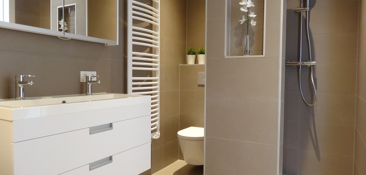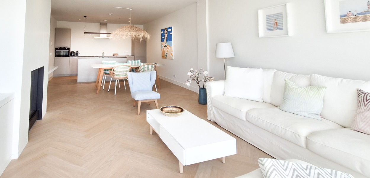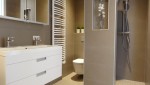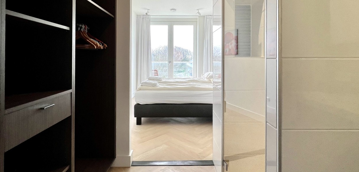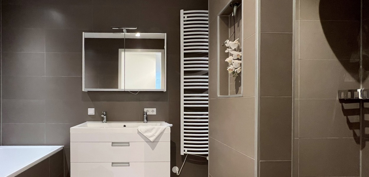 Das Apartment ist mit den beiden komfortablen Schlafzimmern mit luxuriösen Boxspring-Betten und den beiden Badezimmern für vier Personen hervorragend geeignet. In einem Schlafzimmer sind die Betten sogar 2,10 m lang. Das große Badezimmer ist mit einer begehbaren Dusche, einer Badewanne, einem Doppelwaschbecken und WC ausgestattet. Das zweite Badezimmer hat rechts eine Dusche und ein Waschbecken und links einen eingebauten Wandschrank. Eine weitere Toilette befindet sich im Flur, ebenso wie ein praktischer, geräumiger Abstellraum mit Waschmaschine und Trockner. Übrigens verfügt das gesamte Apartment über eine behagliche Fußbodenheizung.