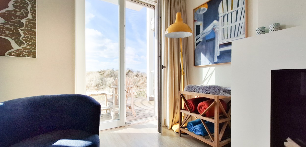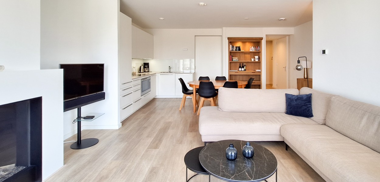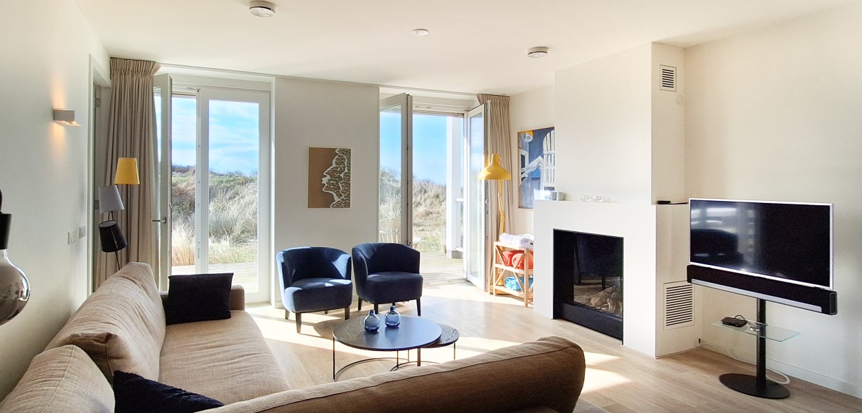 Das Wohnzimmer wirkt durch die Einbauschränke und die offene Küche in L-Form besonders geräumig. Es gibt eine komfortable Sitzecke mit TV. Von dort aus können Sie dem ständig wechselnden Schauspiel der See folgen. Vom Wohnzimmer aus führen zwei doppelte Glastüren auf die Terrasse und den 185 m² großen Garten, mit Sicht auf Strand und Nordsee. Durch die günstige Lage des Apartments können Sie an einem sonnigen Tag schon von ungefähr 10.30 Uhr bis Sonnenuntergang die Sonne genießen. Eine zweite Holzterrasse wurde angelegt, wo Sie sich windgeschützt aufhalten und die Umgebung genießen können.