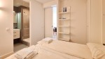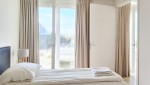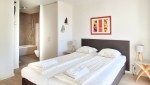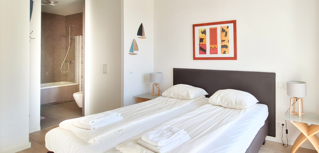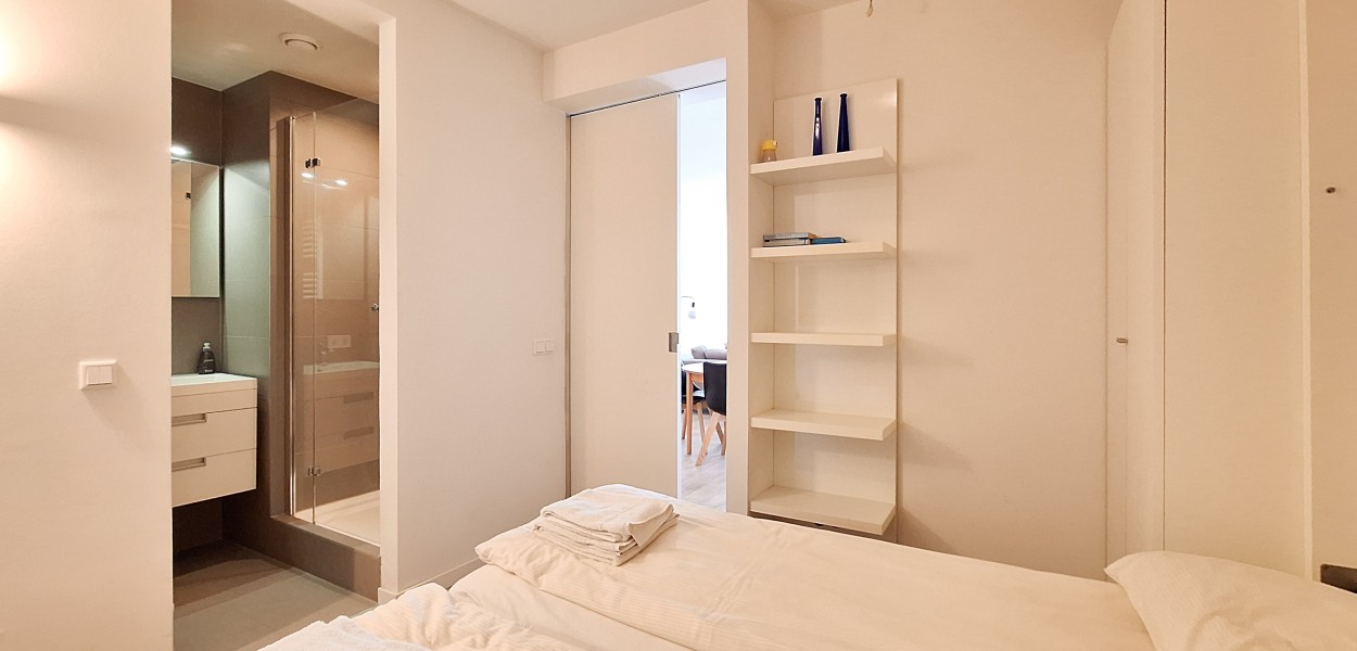 Das Master-Schlafzimmer ist mit einem Doppelbett mit zwei Matratzen ausgestattet und verfügt über ein angeschlossenes Badezimmer mit Badewanne, Doppelwaschbecken und Toilette. Über die Glastüren haben Sie auch vom Schlafzimmer aus Zugang zur Terrasse. Das zweite Schlafzimmer liegt hinter dem Wohnzimmer und kann mit einer breiten Schiebetür geschlossen werden. Über die Verbindung mit dem Wohnzimmer hat dieses Zimmer Tageslicht. Das Zimmer hat zwar kein eigenes Fenster, wird aber gut belüftet. Es gibt eine spezielle Einbauwand, wo Sie ein Doppelbett ausklappen können bzw. einen geräumigen Arbeitstisch benutzen können. Zudem gibt es im Sanitärbereich eine begehbare Dusche und ein Waschbecken. Im Flur befindet sich ein zusätzliches WC wie auch eine praktische geräumige Abstellkammer mit Waschmaschine und Trockner.