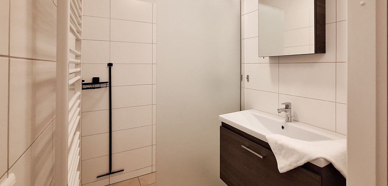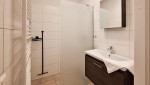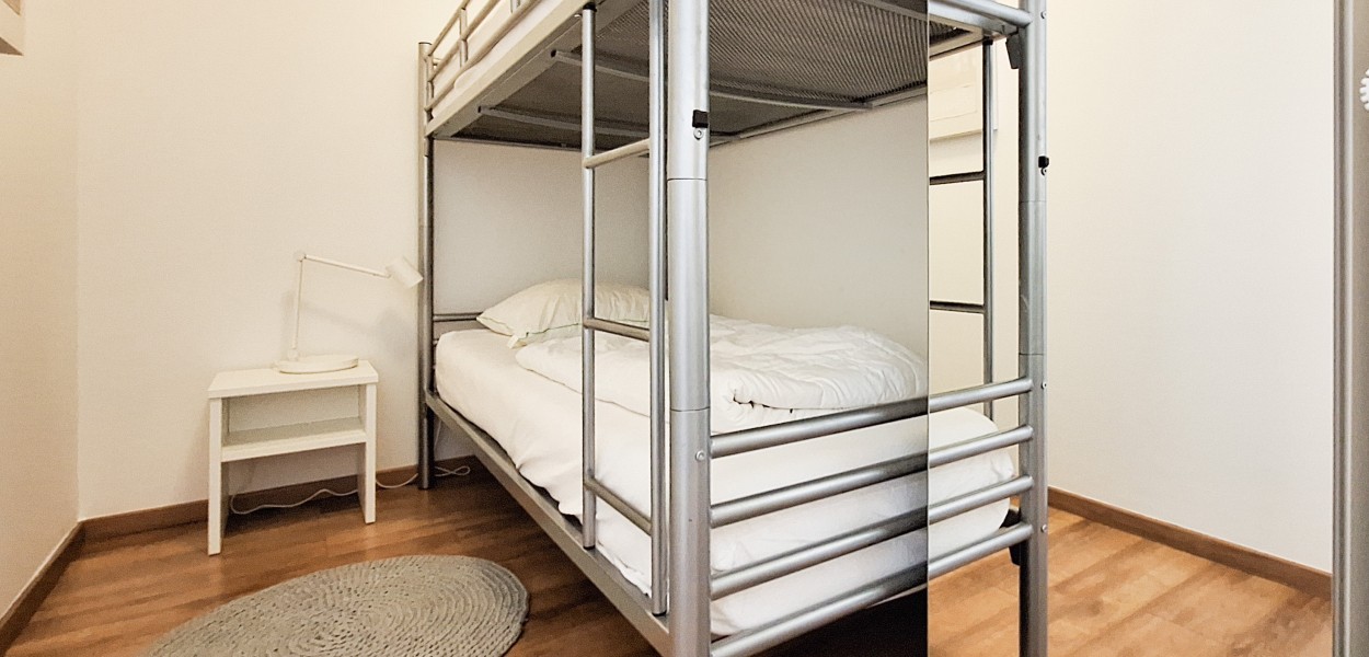 Das Elternschlafzimmer ist elegant und gut durchdacht mit einem hochwertigen Boxspringbett mit Nachttischchen und einem geräumigen Kleiderschrank eingerichtet. Das zweite Schlafzimmer hat ein Etagenbett eventuall für Gäste. Im Badezimmer gibt es einen begehbare Dusche und ein Waschbecken. Im Flur befinden sich eine separate Toilette sowie eine praktische Abstellkammer mit Waschmaschine und Trockner.