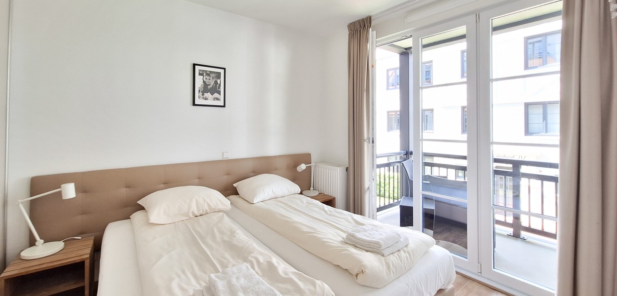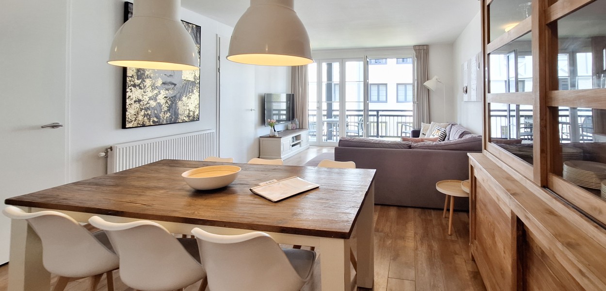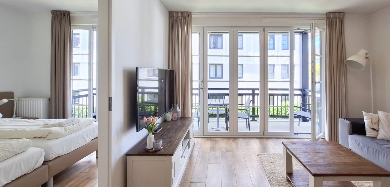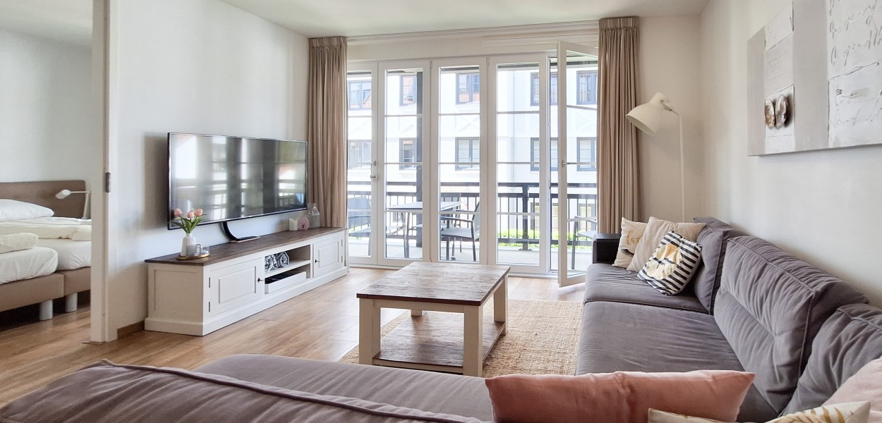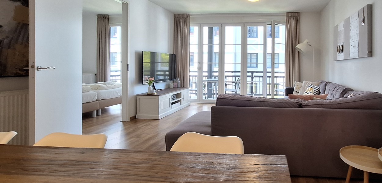 Im ersten Stock von Duinhof V befindet sich dieses ansprechende und wohnliche Apartment von 64 m². Die Glastüren öffnen sich vom Wohnzimmer und vom Schlafzimmer aus auf einen schönen Südwestbalkon.