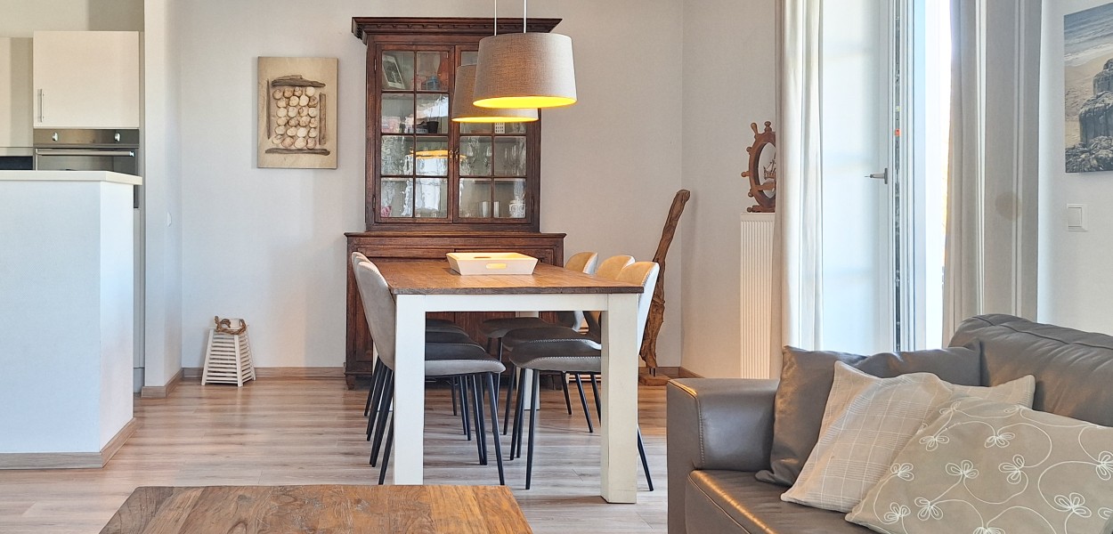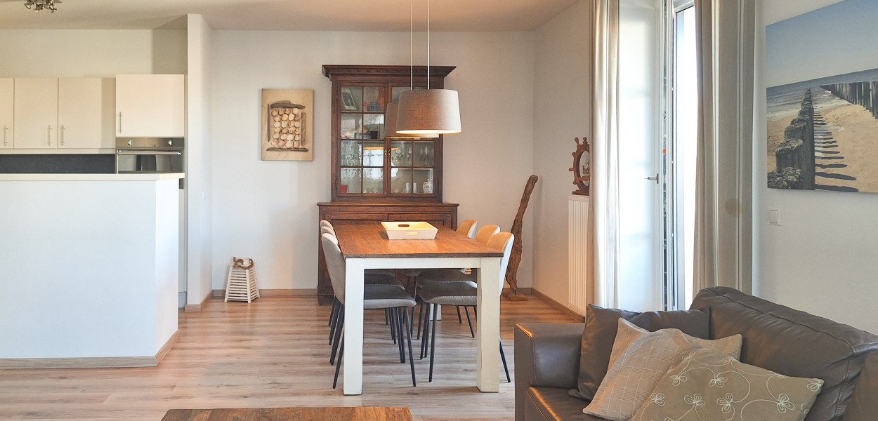 Die schicke offene Küche hat ein Senseo Maschine, eine Kombi-Mikrowelle, eine Kühl-Gefrier-Kombination und eine Spülmaschine. Dieses Sechs-Personen-Apartment ist das perfekte Domizil für Ihre Ferien in Seeland.
