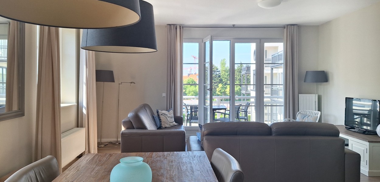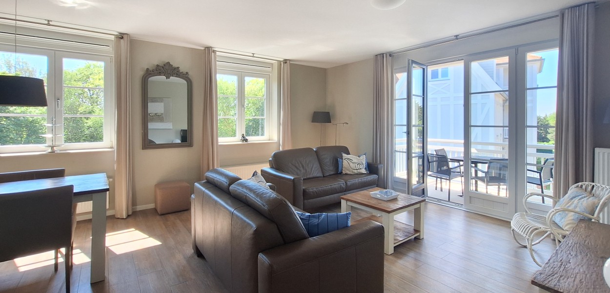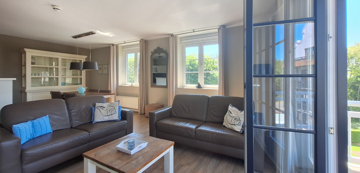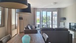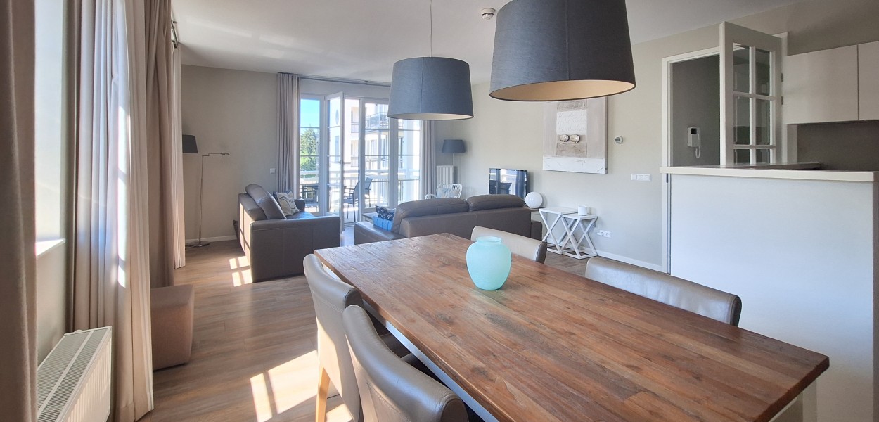 Auf dem zweiten Stock befindet sich dieses komfortable und sonnige Apartment mit 78 m². Das Wohnzimmer ist geschmackvoll eingerichtet und wirkt durch die luxuriöse, offene Küche noch geräumiger. Die Glastüren öffnen sich auf den Südwestbalkon, der eine wunderbare Aussicht auf die Umgebung bietet. Auf Anfrage ist für dieses Apartment eine zweite Parkplatz verfügbar.