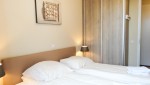 Beide Schlafzimmer sind elegant und gut durchdacht mit hochwertigen Boxspringbetten und geräumigen Schränken eingerichtet. Im großzügigen Badezimmer gibt es eine geräumige, begehbare Dusche mit Glaswand, zwei Waschbecken und eine Toilette mit erhöhtem Sitz. Eine zweite Toilette gibt es im Flur, wo sich auch der praktische Abstellraum mit Waschmaschine und Trockner befindet. Die offene Küche verfügt über ein Nespresso Maschine, eine Kombi-Mikrowelle, eine Kühl-Gefrier-Kombi sowie eine Spülmaschine.