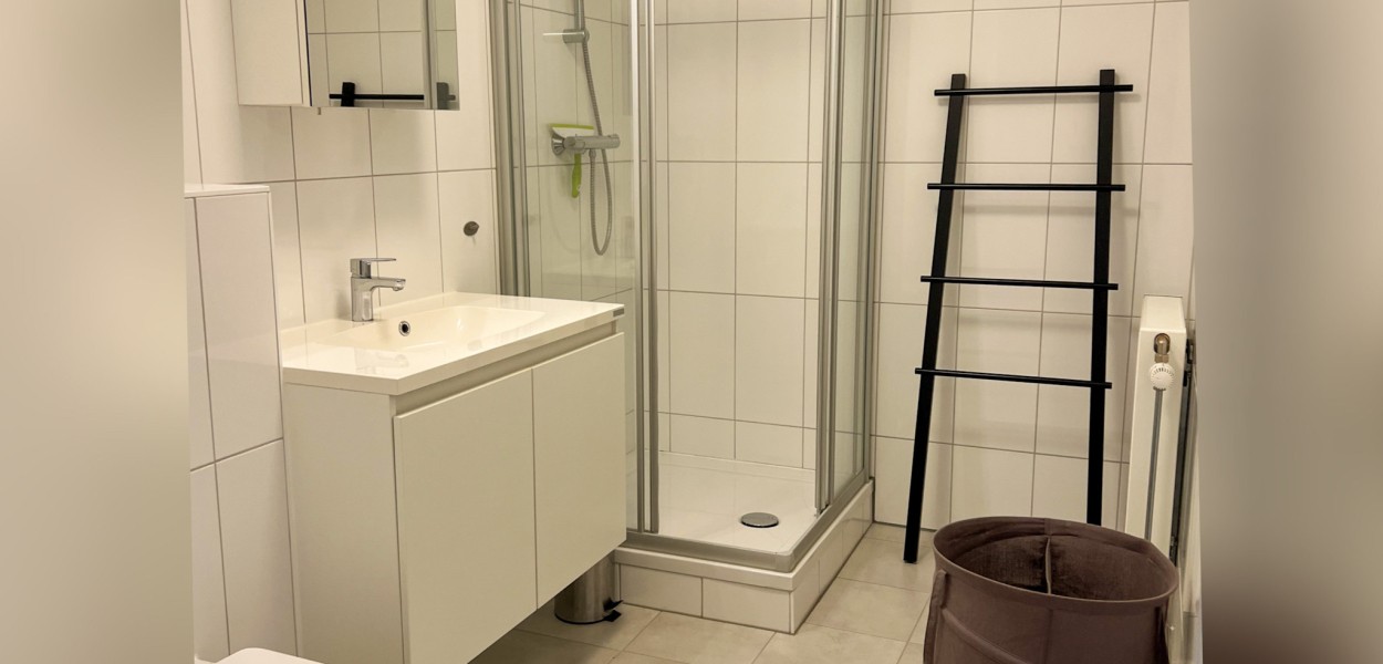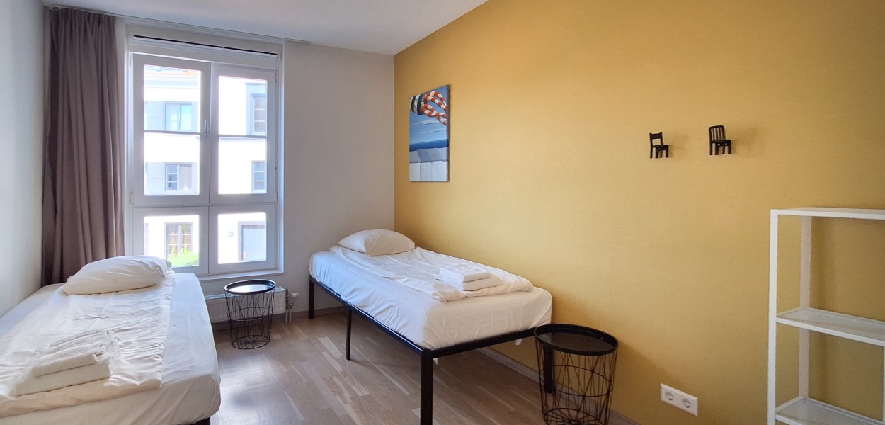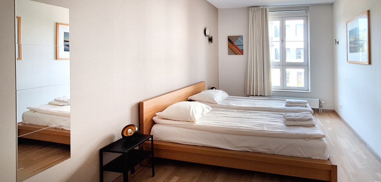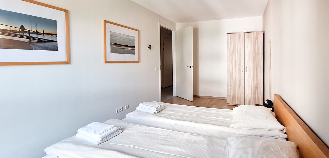 Das Hauptschlafzimmer ist komplett möbliert. Das zweite Schlafzimmer hat zwei Einzelbetten. Die Betten sind mit Tempur-Matratzen ausgestattet. Das Badezimmer hat eine Dusche, ein Waschbecken und eine Toilette. Eine separate Toilette befindet sich im Flur. Im Abstellraum stehen Ihnen unter anderem eine Waschmaschine zur Verfügung.