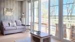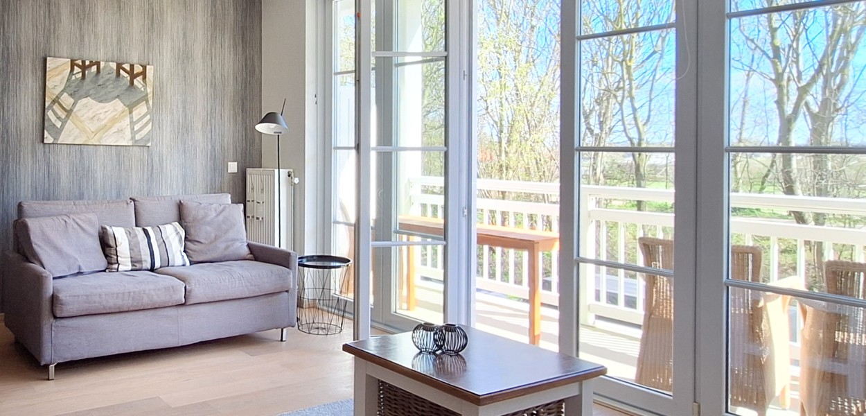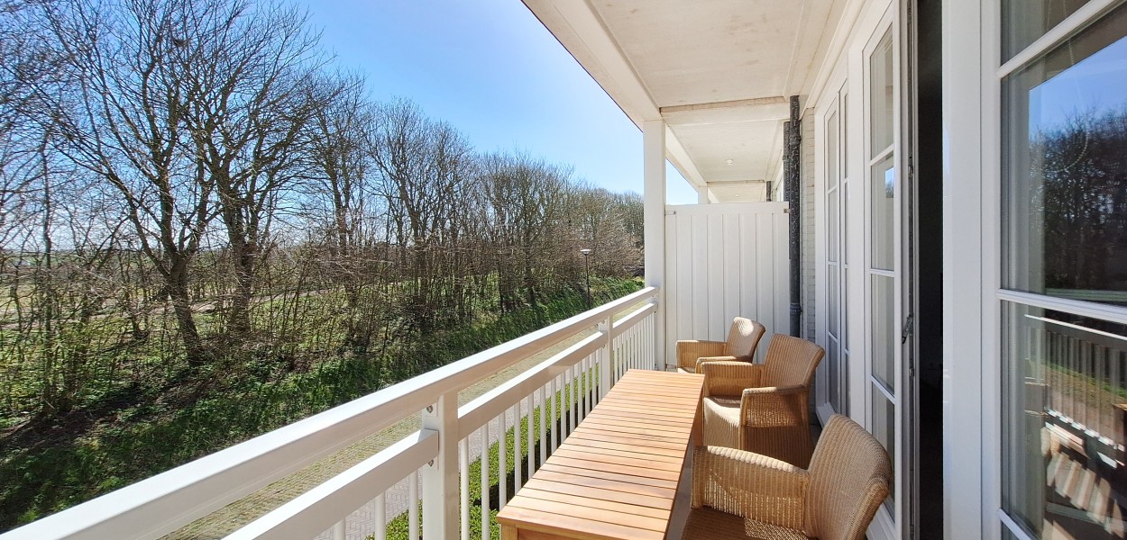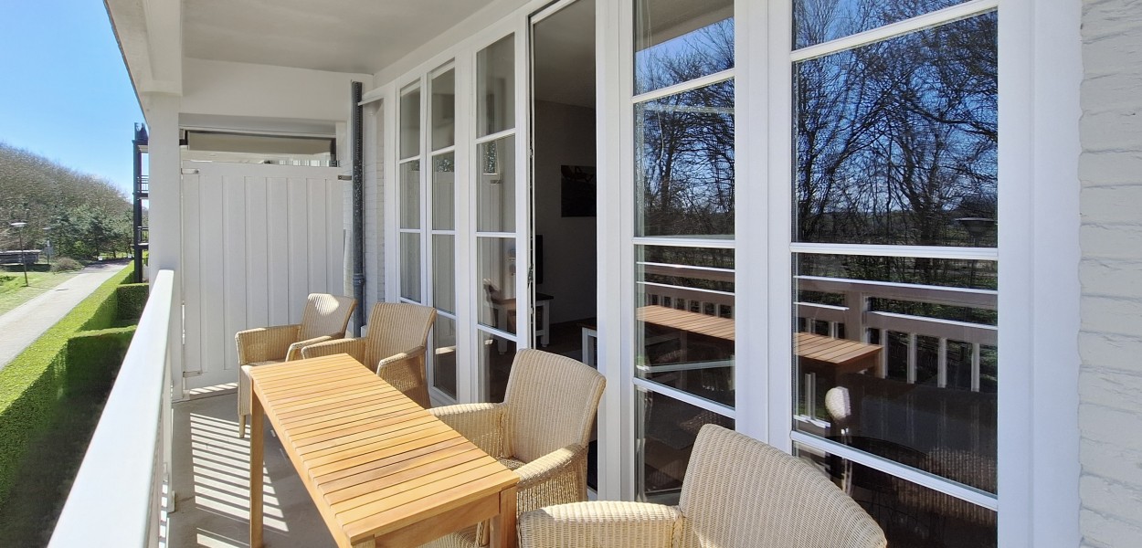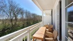 Durch die attraktiven Flügeltüren gelangen Sie auf den schönen Balkon mit Blick auf die Bäume.