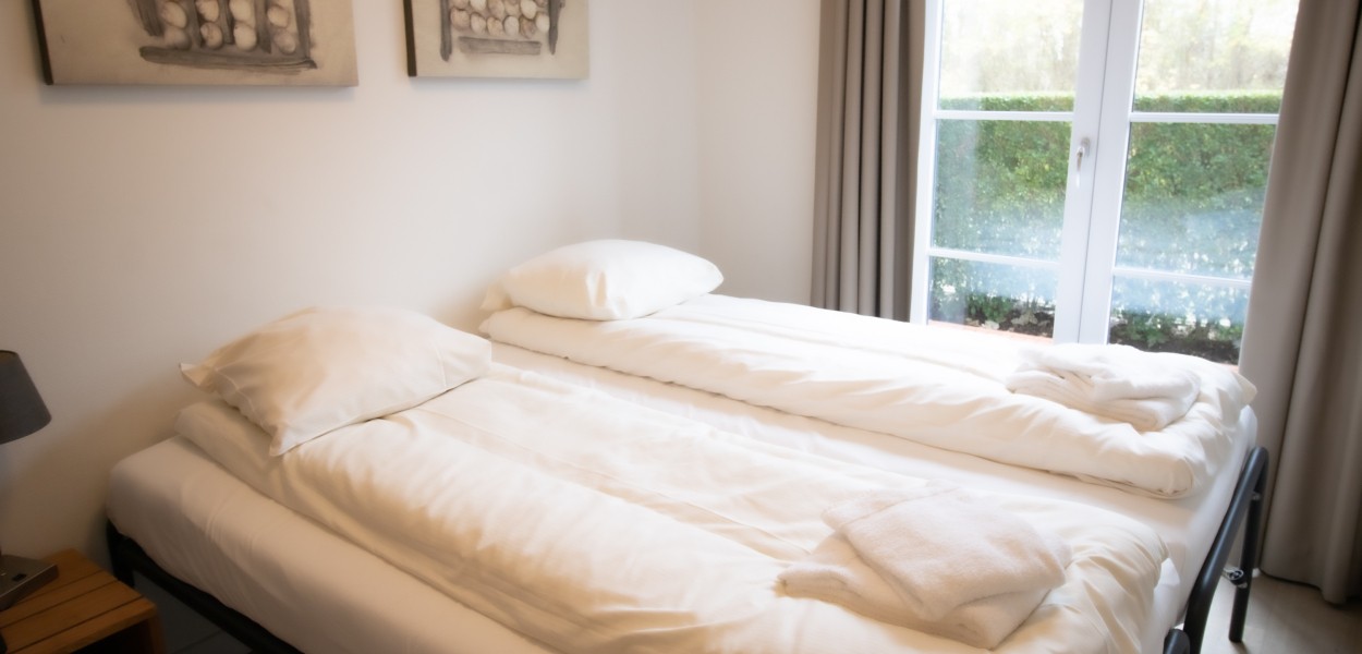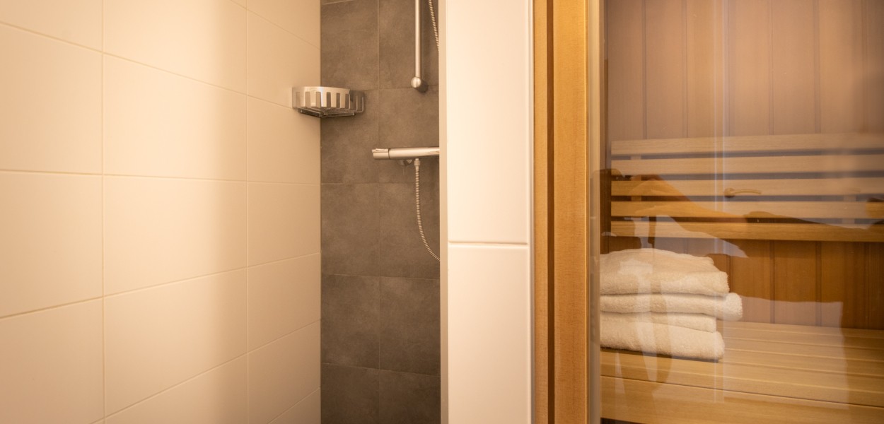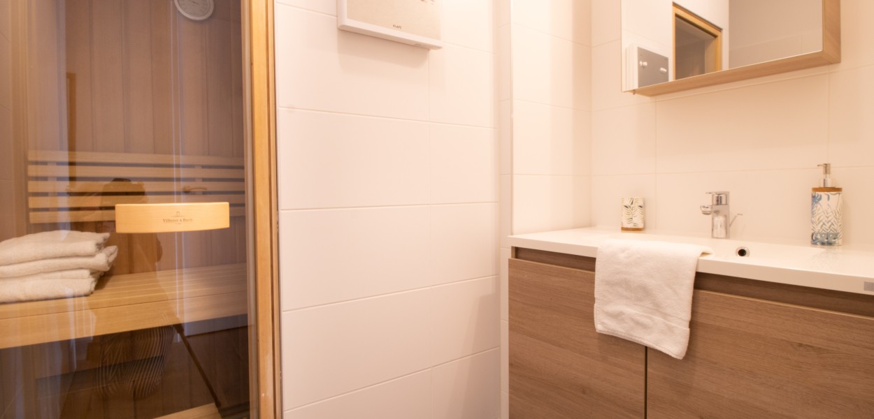 Ein Schlafzimmer ist elegant und aufwändig eingerichtet; Sie schlafen in einem hochwertigen Boxspringbett. Im zweiten Schlafzimmer gibt es zwei bequeme Einzelbetten. Außerdem verfügen beide Schlafzimmer über TV. Im Badezimmer gibt es eine finnische Sauna, gut für Herz und Haut. Weiterhin ist das Badezimmer mit einer begehbaren Dusche und einem Waschbecken ausgestattet. Eine zusätzliche Toilette finden Sie im Eingangsbereich, ebenso einen praktischen Abstellraum mit Wasch-Trocken-Kombi.