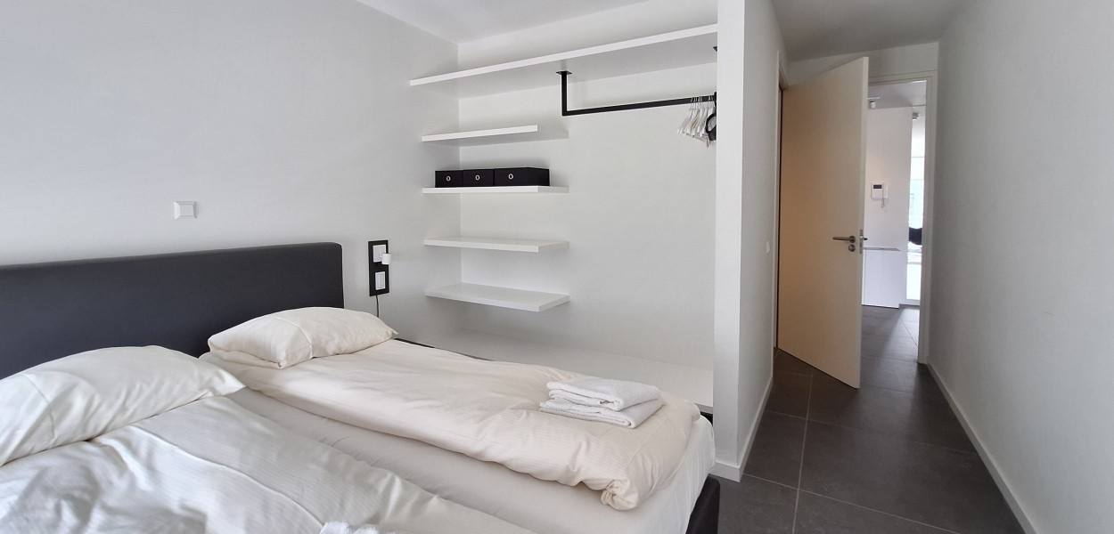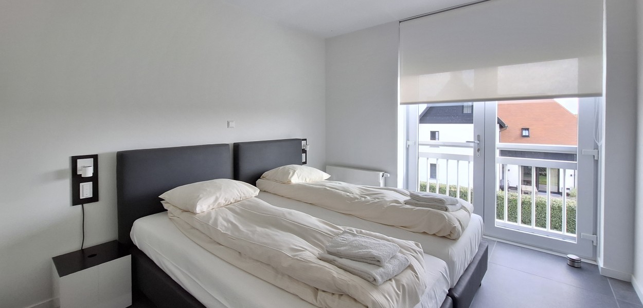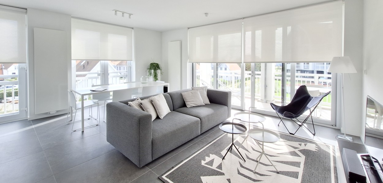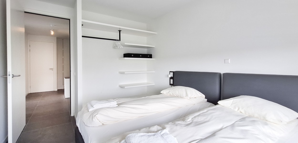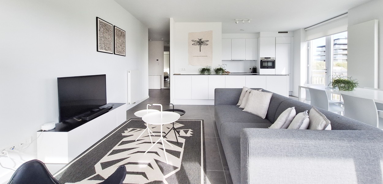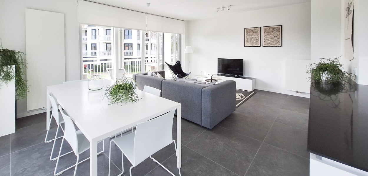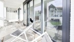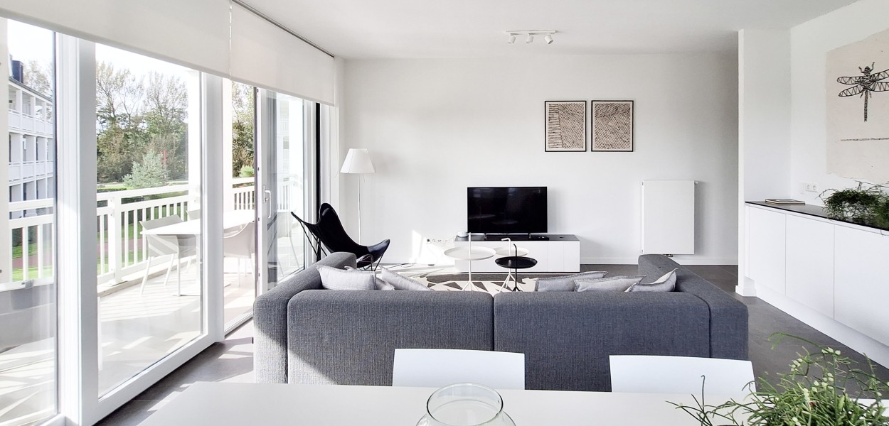 Ein hochmodernes und stilvoll eingerichtetes Eckapartment mit 89 m² in der ersten Etage mit zwei Schlafzimmern und zwei angeschlossenen Bädern. Durch die großen Fenster und Balkontüren im Wohnzimmer, die auf den Südbalkon führen, sowie die gut durchdachte Einrichtung, erscheint dieses Apartment sehr großzügig.