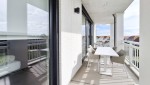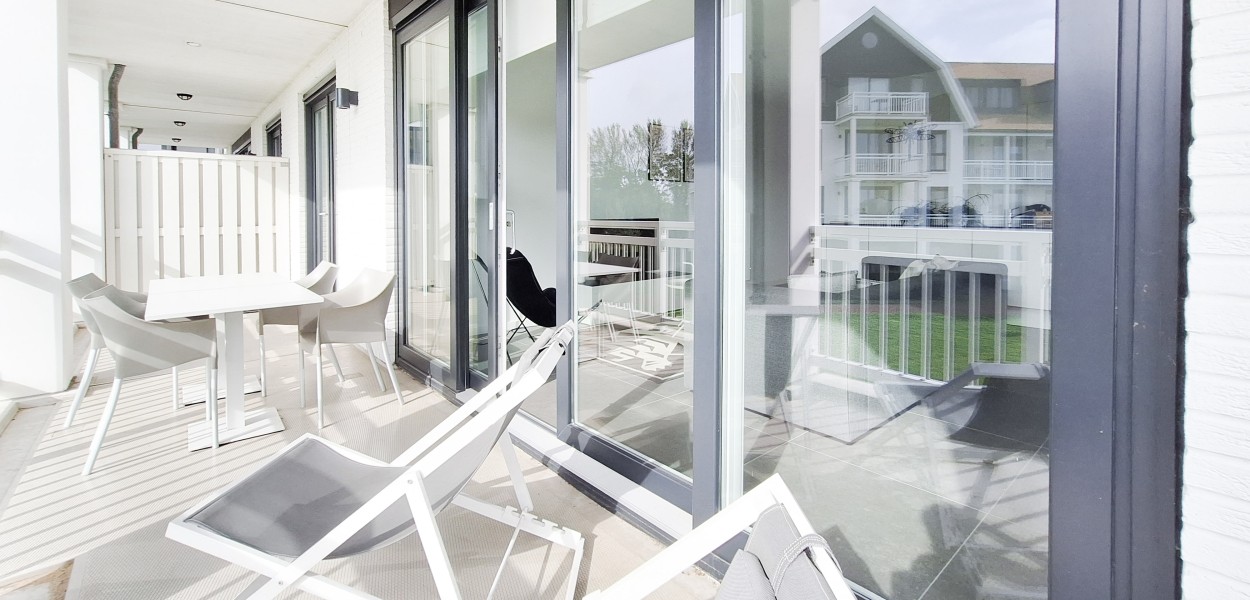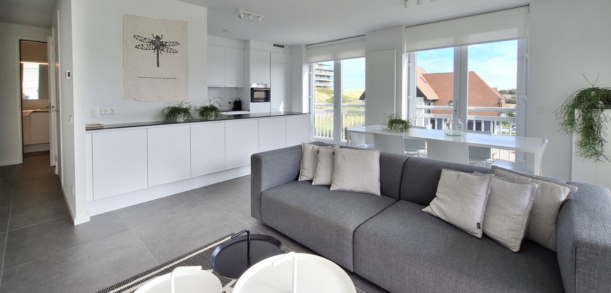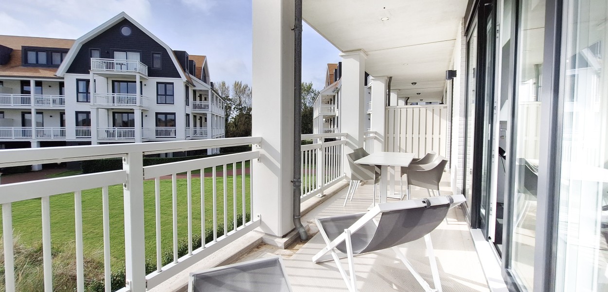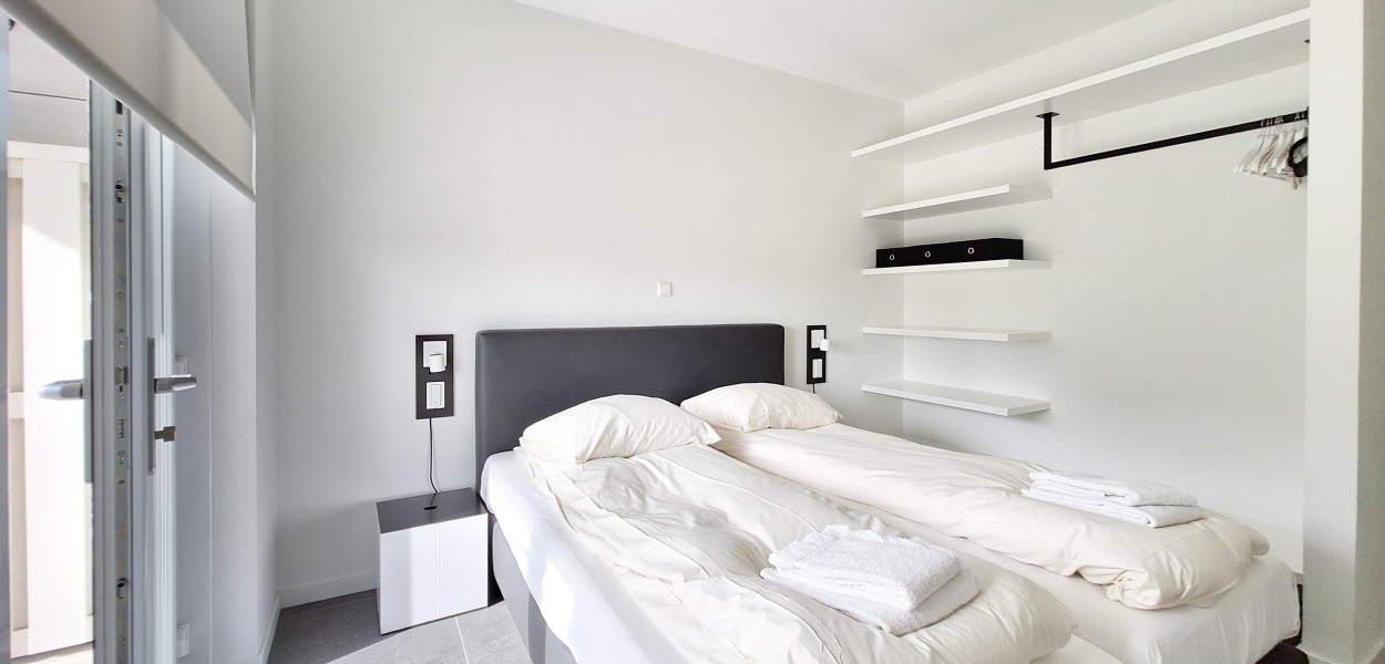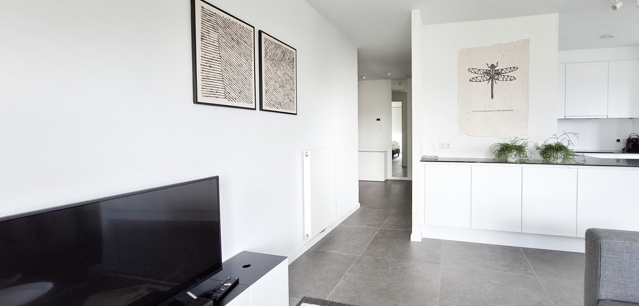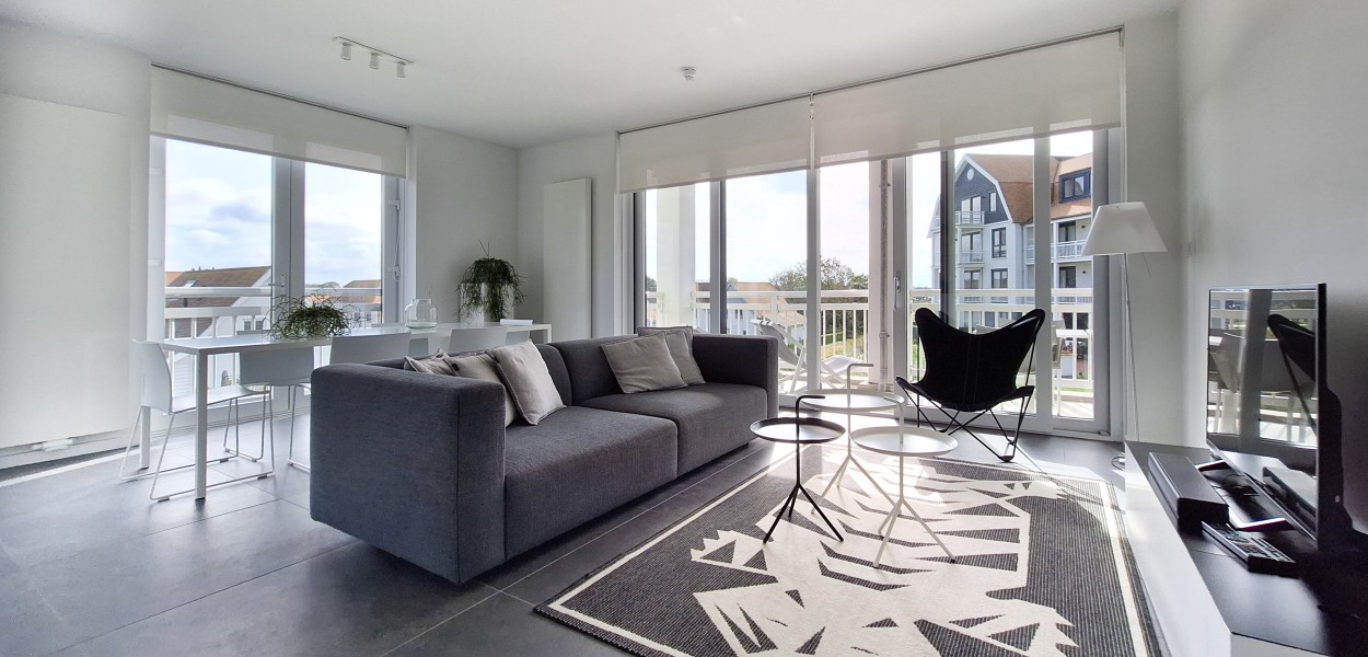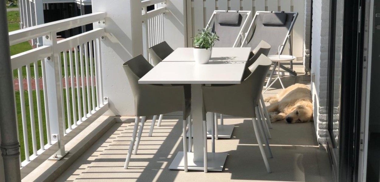 Ein hochmodernes und stilvoll eingerichtetes Eckapartment mit 89 m² in der ersten Etage mit zwei Schlafzimmern und zwei angeschlossenen Bädern. Durch die großen Fenster und Balkontüren im Wohnzimmer, die auf den Südbalkon führen, sowie die gut durchdachte Einrichtung, erscheint dieses Apartment sehr großzügig.