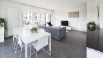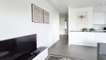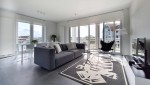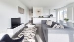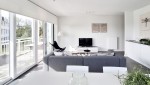 Die Kombination aus hellem und geradlinig-modernem Wohnzimmer mit großen Fenstern, der luxuriösen offenen Küche und dem sonnigen Südbalkon machen dieses Apartment ganz ideal, um stilvoll Ruhe zu finden.