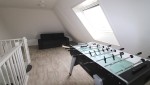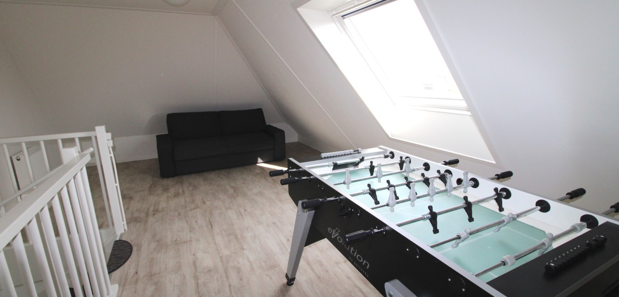 Der zweite Stock ist ein geräumiger Dachboden, wo eine Lounge mit Gefrierschrank, bequemem Sofa, Tischfußball und anderen Spielen eingerichtet wurde. In einem Nebenraum befinden sich hier auch der Heizkessel und die Belüftungseinheit.