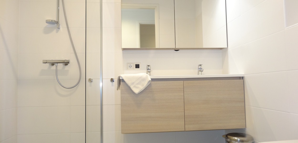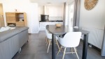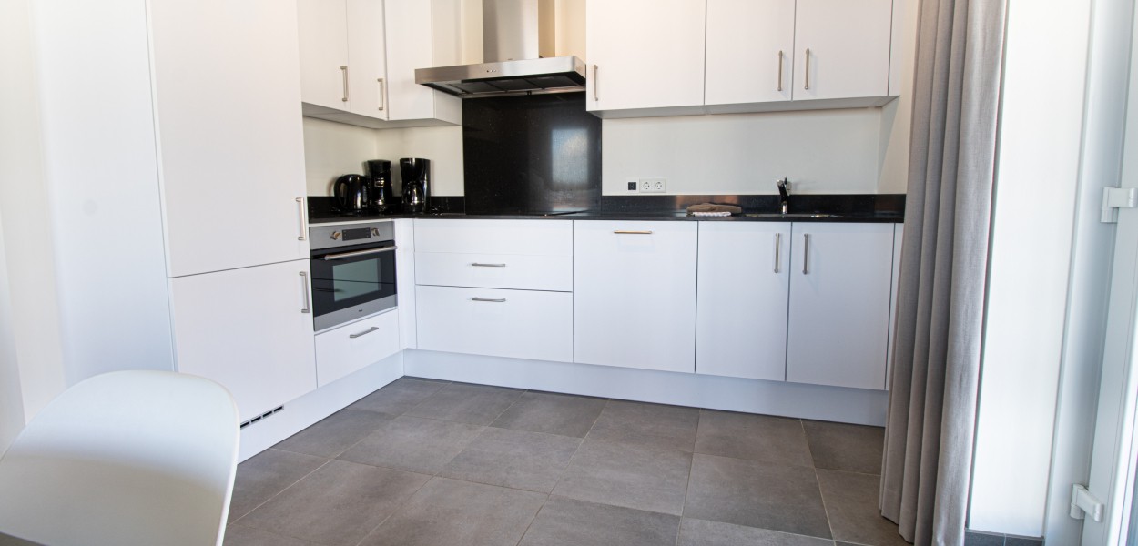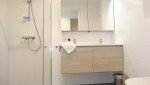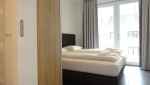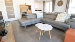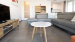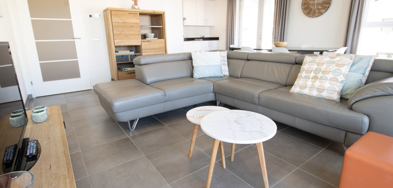 Das Wohnzimmer hat eine bequeme Sitzecke und einen gemütlichen Essbereich. Daran angeschlossen befindet sich eine geräumige offene Küche, die mit Induktionsherd, Kombi-Mikrowelle, Kühlschrank und Geschirrspüler ausgestattet ist. Beide Schlafzimmer sind mit luxuriösen Boxspringbetten elegant eingerichtet. Die Badezimmer schließen sich direkt daran an und sind unterschiedlich ausgestattet. Das eine Bad verfügt über eine begehbare Dusche, Doppelwaschbecken und Toilette. Das andere hat eine begehbare Dusche und ein Waschbecken. Ein weiteres WC sowie eine praktische Abstellkammer mit Waschmaschine und Trockner befinden sich auf dem Flur.
