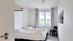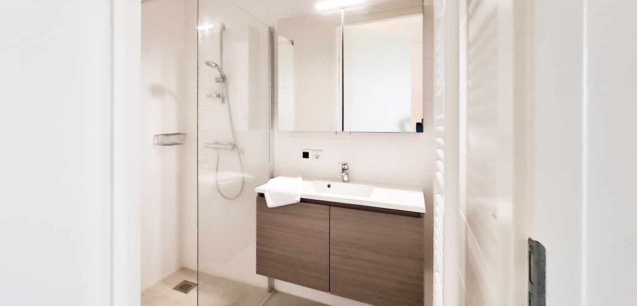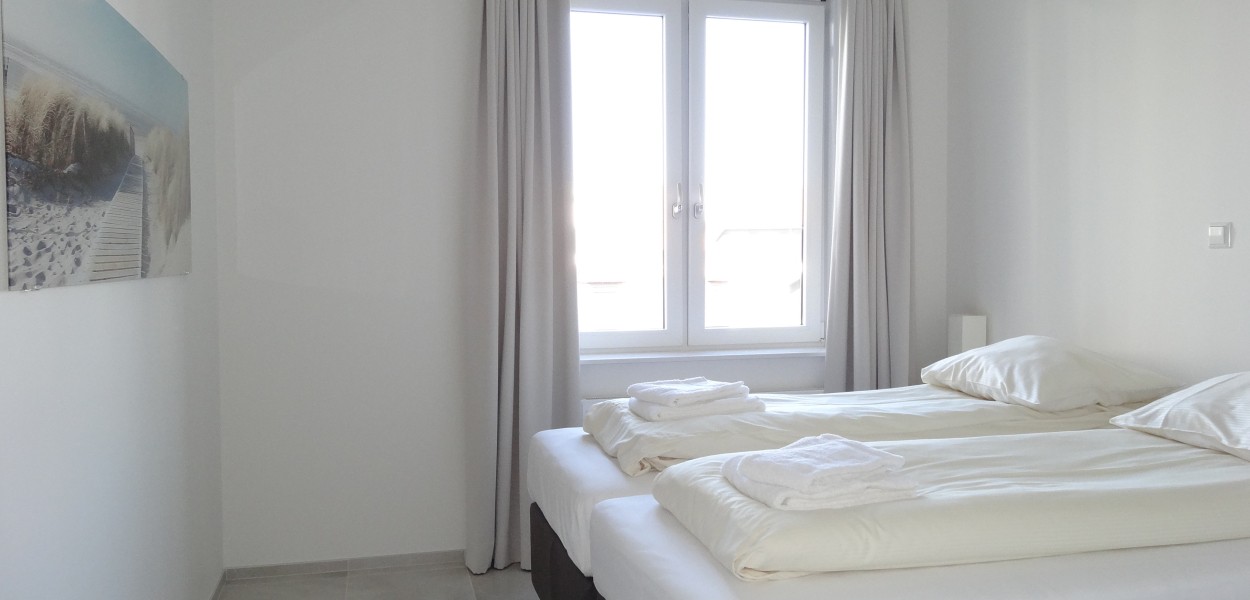 Der Wohnbereich ist praktisch und gleichzeitig mit viel Flair eingerichtet. Es gibt dort eine bequeme Sitzecke mit TV-Gerät sowie eine Essecke mit Esstisch und trendigen Stühlen. Die offene Küche ist mit allem Komfort ausgestattet und verfügt neben einem Induktionsherd über eine Kombi-Mikrowelle, einen Kühlschrank, eine Nespresso-Maschine sowie einen Geschirrspüler. Die Schlafzimmer sind bequem und wohnlich eingerichtet. Sie schlafen in luxuriösen Boxspringbetten, zudem schließt sich das Badezimmer direkt an das Schlafzimmer an. Das erste Bad hat eine begehbare Dusche, ein Doppelwaschbecken und eine Toilette, das zweite hat eine begehbare Dusche und ein Waschbecken. Eine weitere Toilette und auch eine praktische Abstellkammer mit Waschmaschine und Trockner finden sich auf dem Flur.
