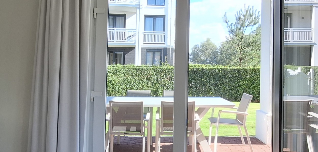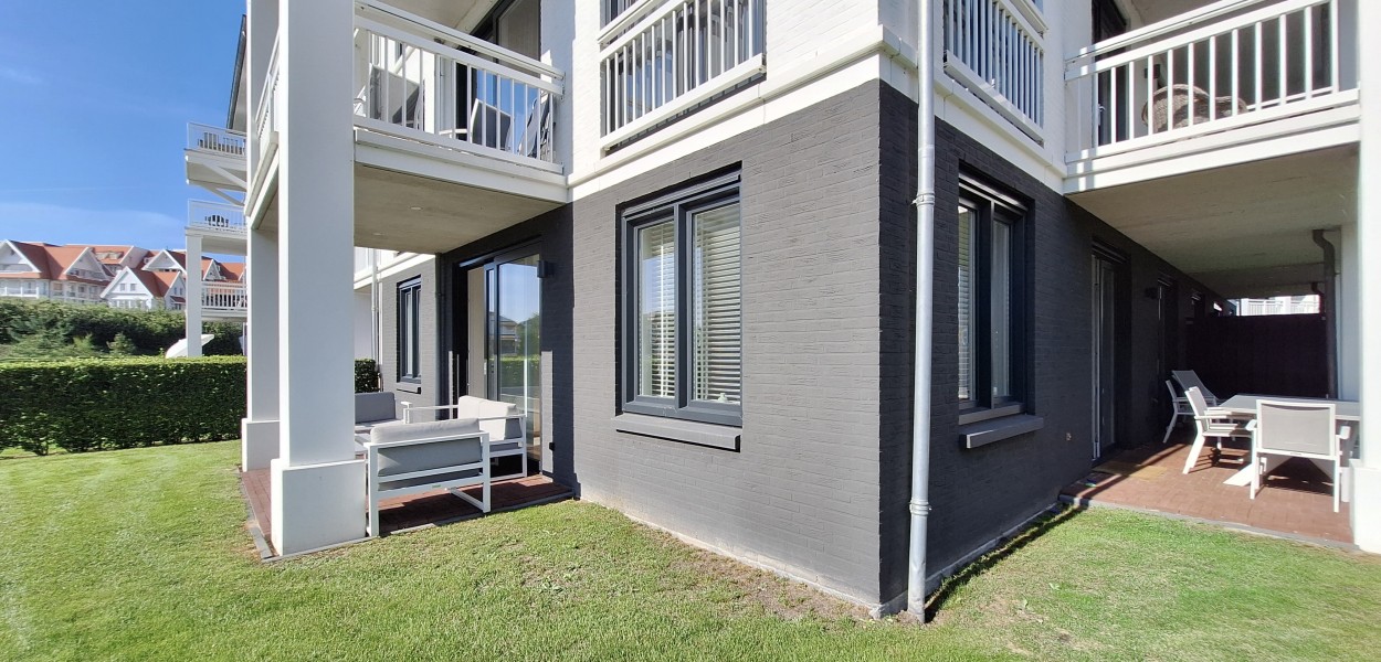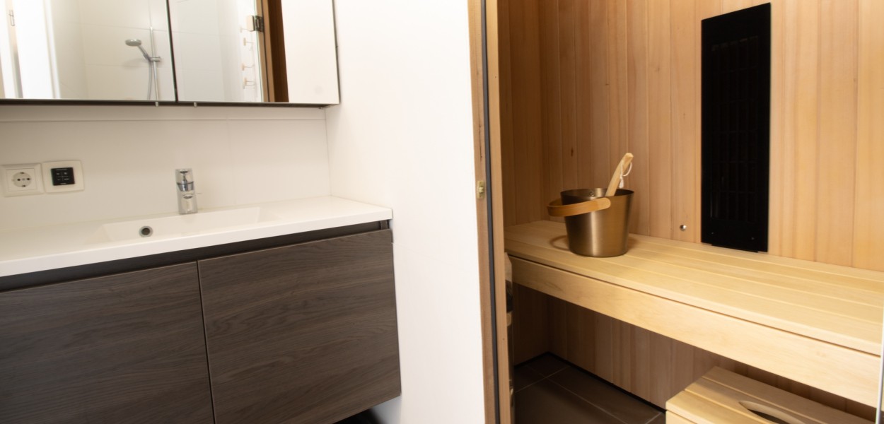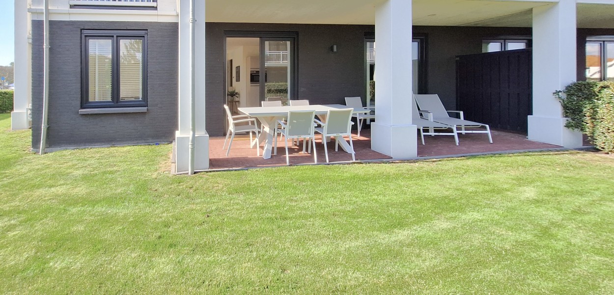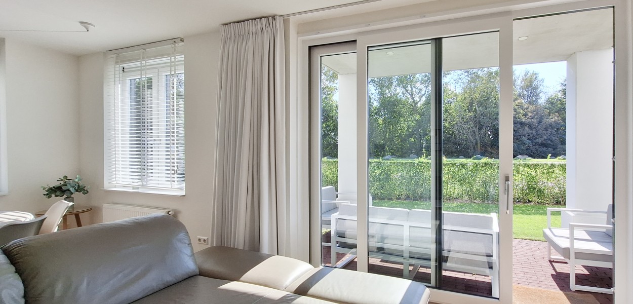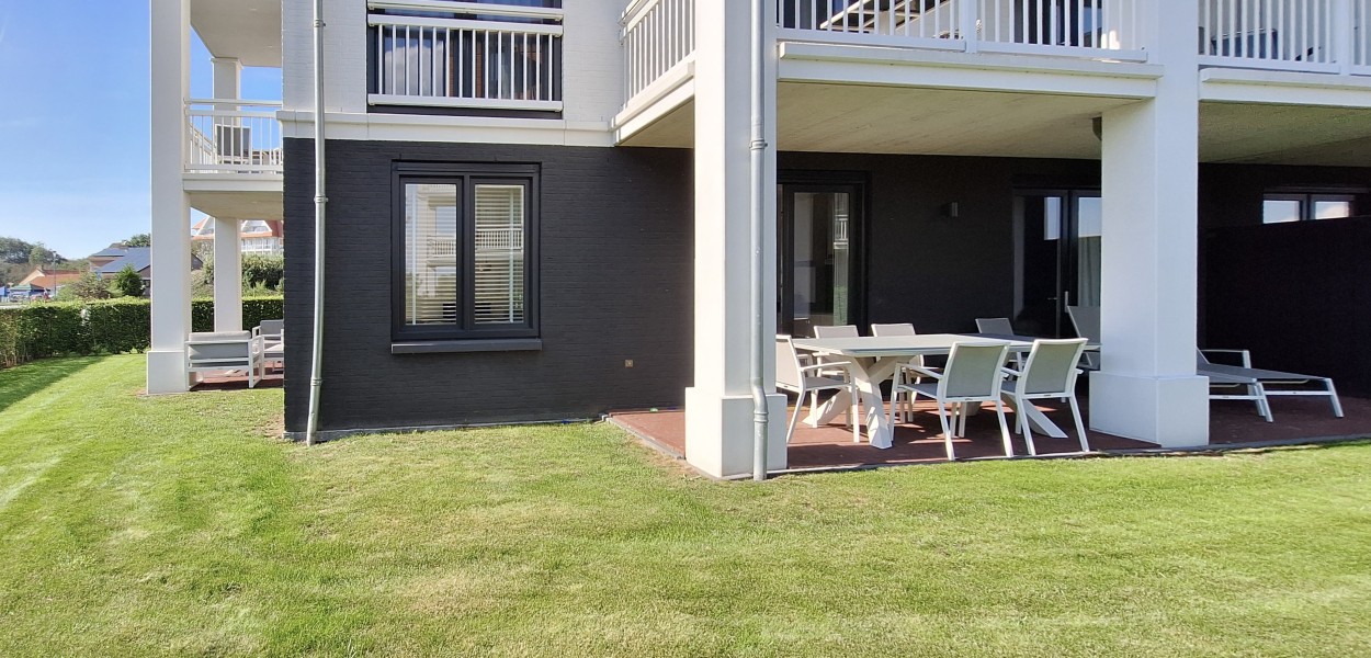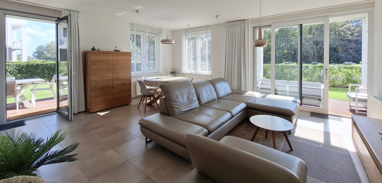 Die Kombination von hellem Wohnzimmer, luxuriöser Sauna und geräumigem Garten geben diesem Apartment Luxus und Wohnkomfort zu allen Jahreszeiten.