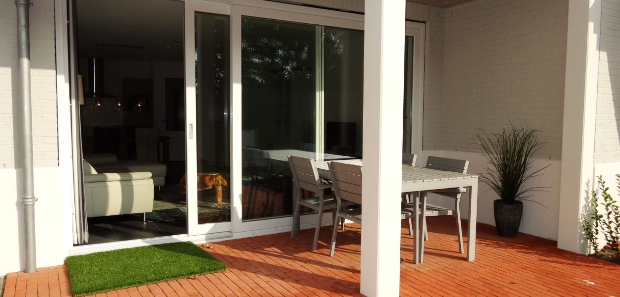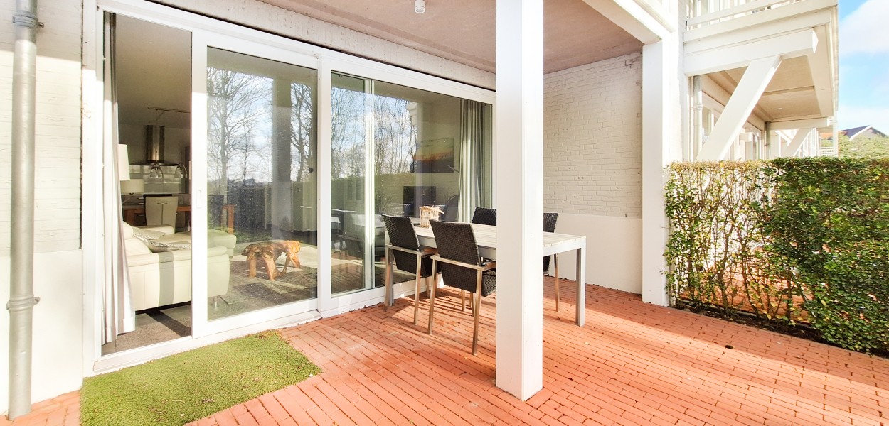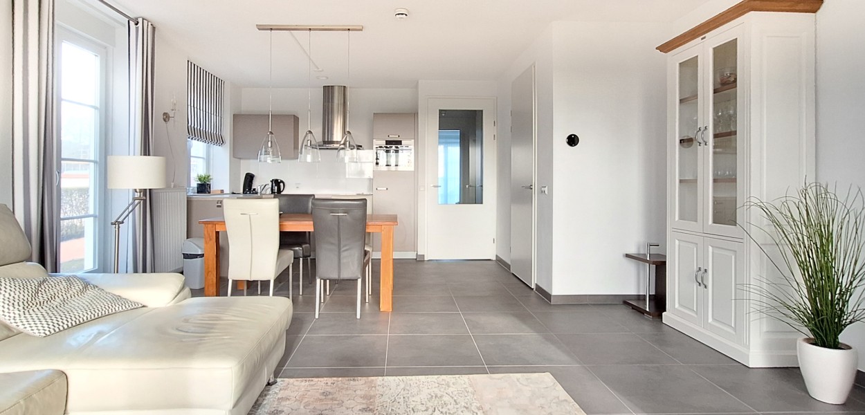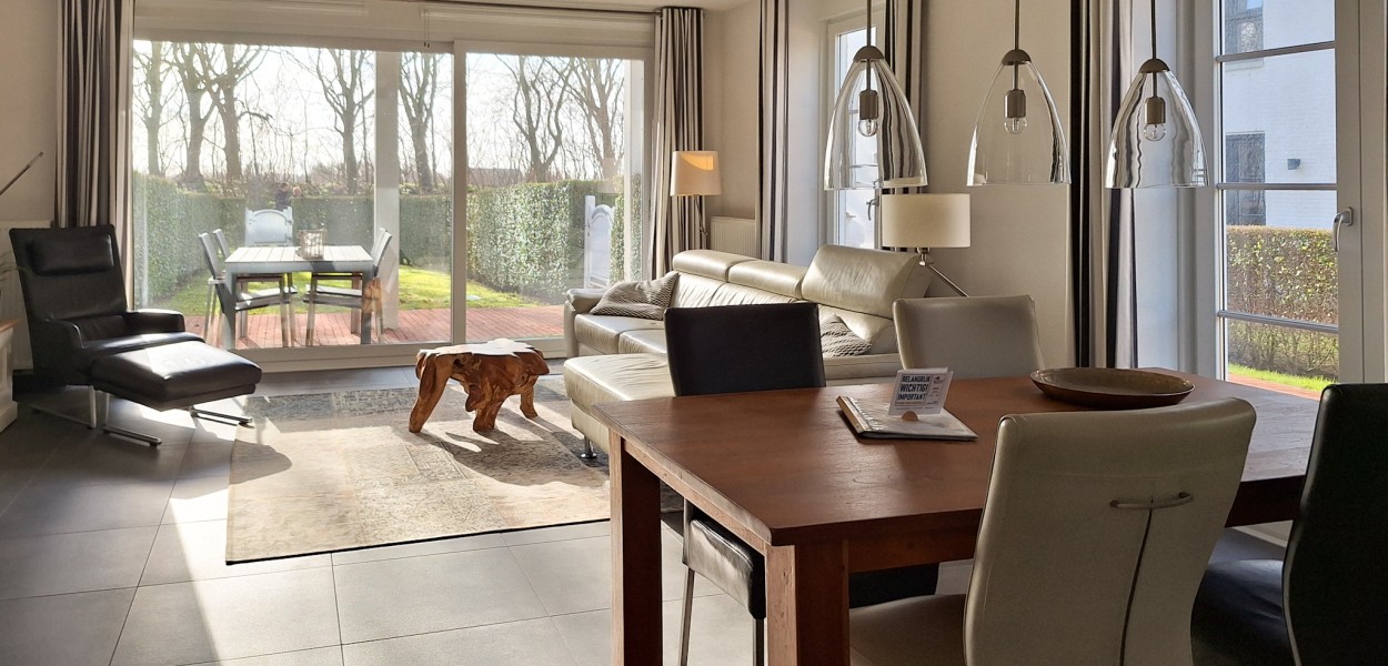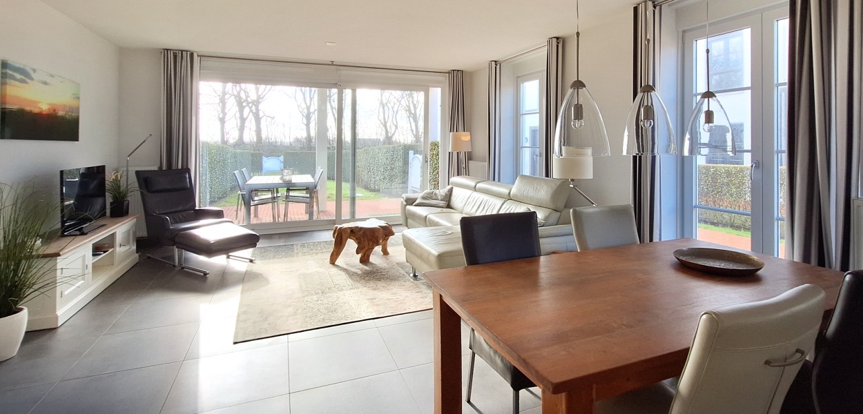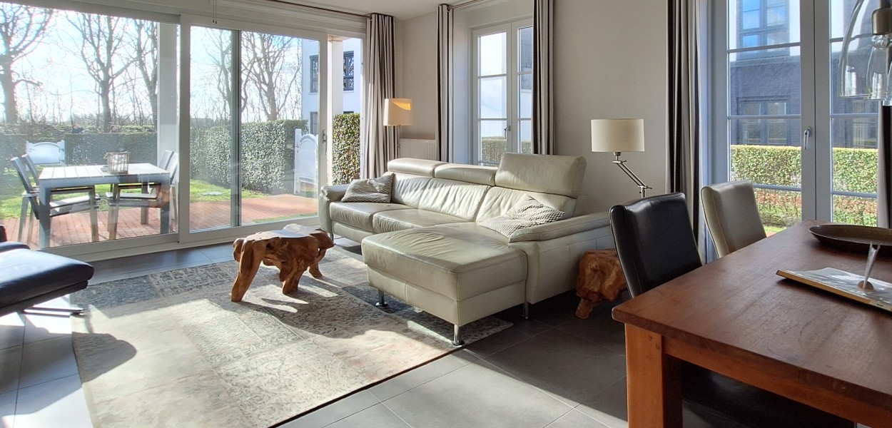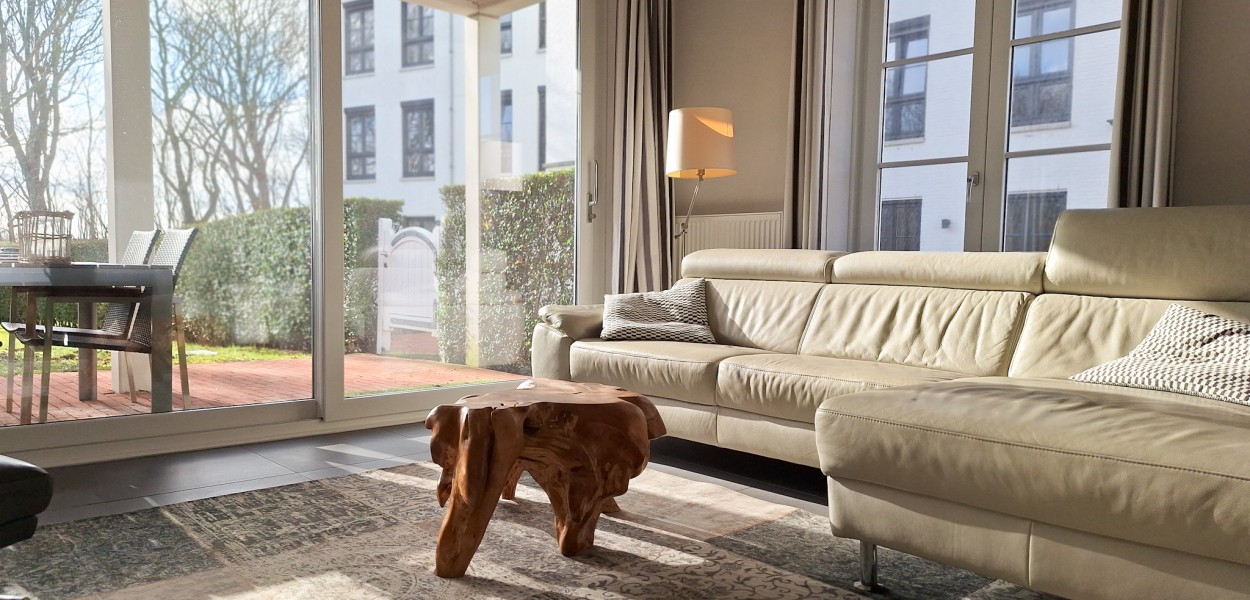 Diese sonnige und elegant eingerichtete 85 m² große Eckwohnung befindet sich im Erdgeschoss und verfügt über einen schönen Garten und eine Terrasse mit Südausrichtung - ideal zum Entspannen im Freien. Das gemütliche Wohnzimmer verfügt über ein bequemes Ledersofa, einen Sessel mit Beinauflage, einen Flachbildfernseher (inklusive Basispaket) und eine große Schiebetür mit direktem Zugang zum Garten. Dank der vielen Fenster ist das Haus herrlich hell.