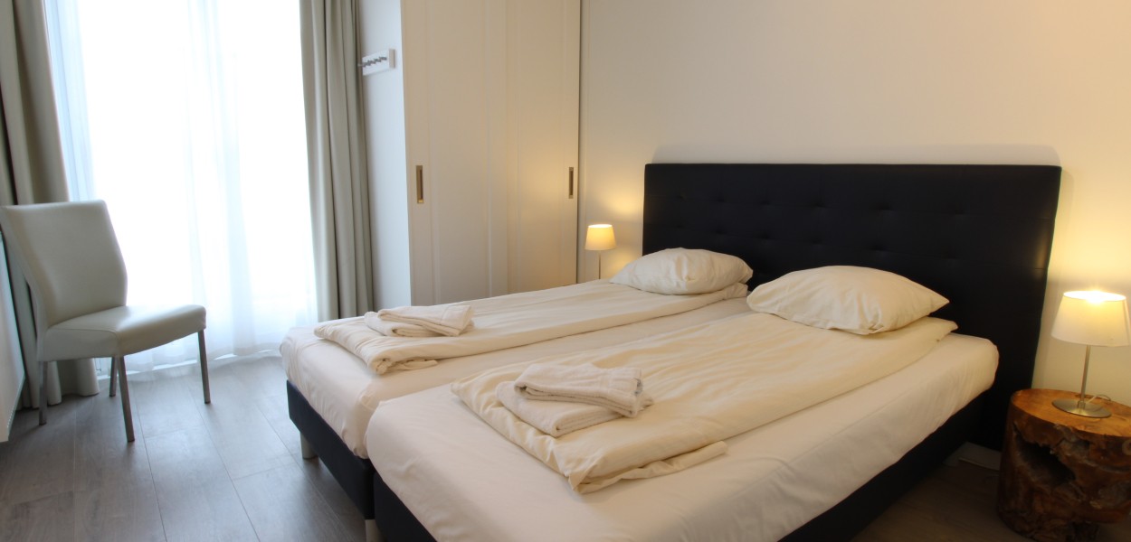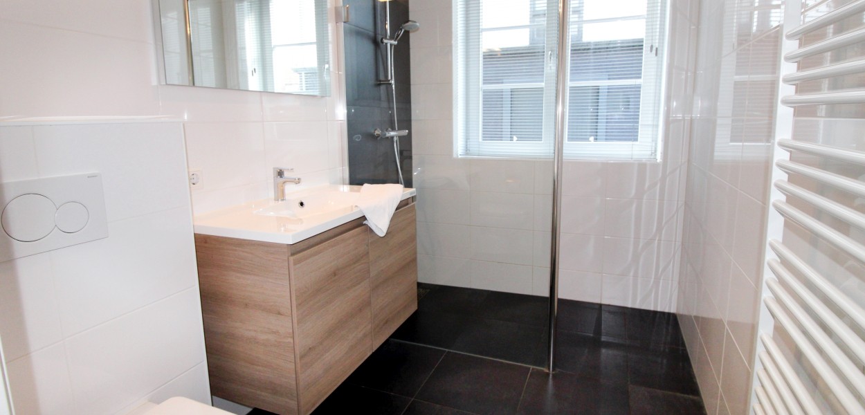 Die beiden geräumigen Schlafzimmer sind geschmackvoll eingerichtet und mit luxuriösen Boxspringbetten ausgestattet, von denen eines extra lang ist (2,10 m). Das Hauptschlafzimmer bietet ausreichend Platz für z.B. ein Babybett. Das komfortable Badezimmer verfügt über eine begehbare Dusche, ein Waschbecken und eine Toilette. Dank des gekippten Fensters genießen Sie auch hier natürliches Tageslicht. Außerdem gibt es eine separate Toilette im Flur, sowie einen praktischen Abstellraum mit Waschmaschine und Trockner.