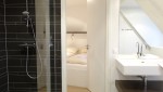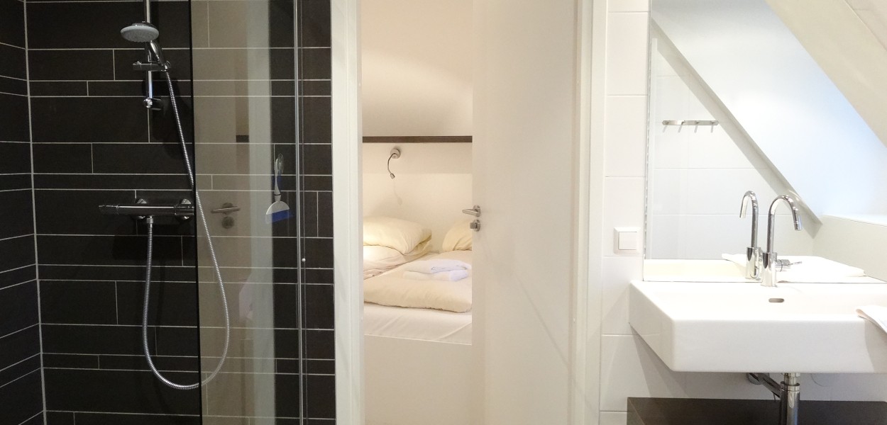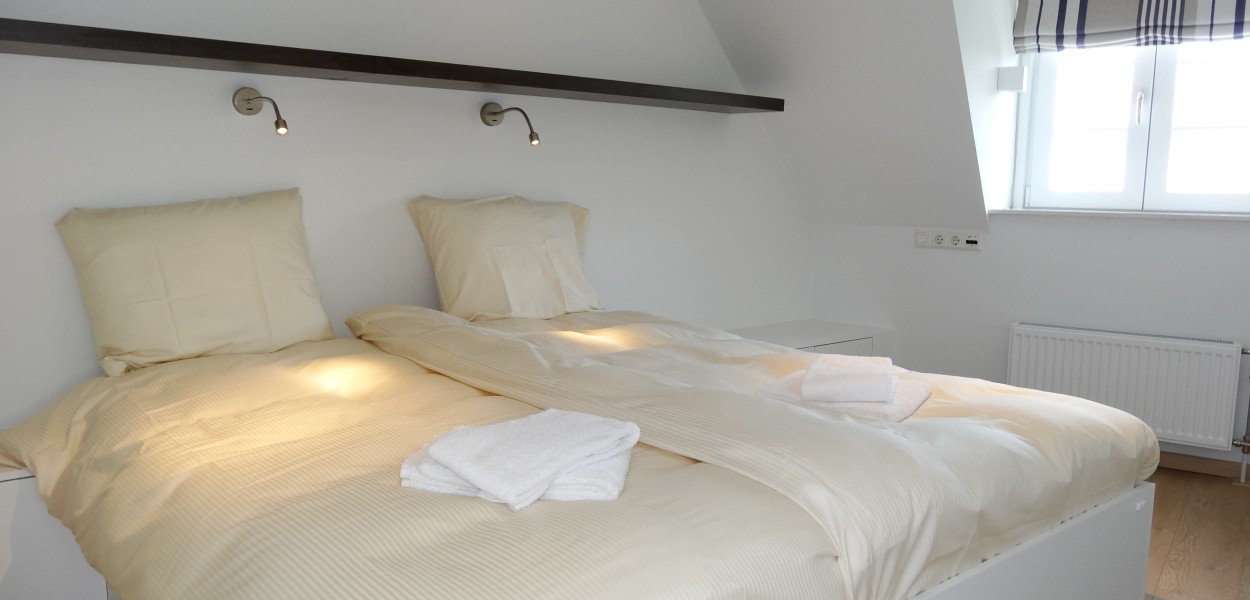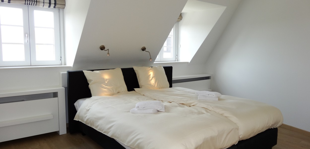 Das große Penthouse verfügt über zwei elegante Elternschlafzimmer mit hochwertigen Boxspringbetten und direkt angeschlossenen Badezimmern. Die Betten in einem dieser Zimmer haben Überlänge von 2,10 m. Das dritte Schlafzimmer hat ein praktisches Etagenbett, ein bequemes Hochbett und ein Einzelbett. Dieses Schlafzimmer hat Zugang zum selben Badezimmer wie eines der Elternschlafzimmer. Die beiden Bäder sind mit begehbarer Dusche und Waschbecken ausgestattet, eines zusätzlich mit einer Toilette. Eine zweite Toilette befindet sich im Eingangsbereich, ebenso eine praktische Abstellkammer mit einer Wasch-Trocken-Kombination.