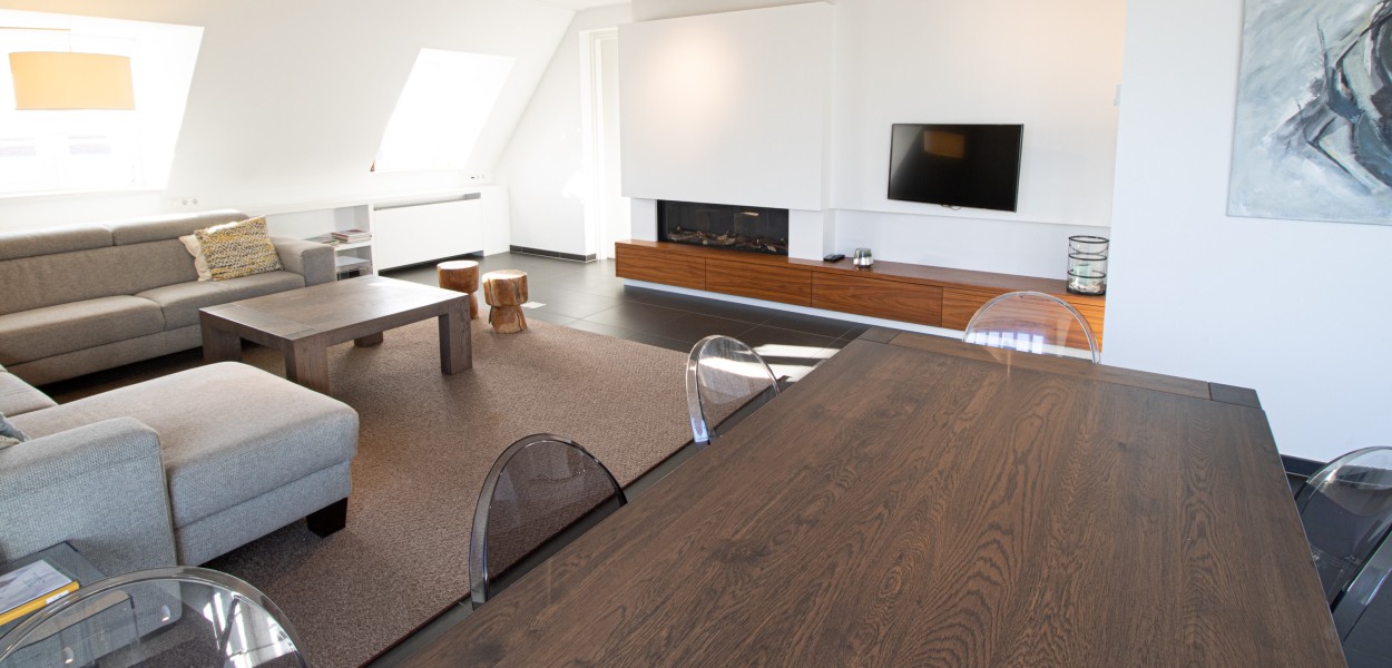 Die großzügig angelegte offene Küche ist mit einer Kücheninsel luxuriös konzipiert und verfügt über ein Nespresso-Maschine, einen Backofen, Mikrowelle, Kühlschrank, separaten Gefrierschrank und einen Geschirrspüler. Die Kombination von großem Wohnzimmer mit Gasofen, offener Küche und geschmackvollen Terrassentüren auf den schön gelegenen Südwestbalkon sorgt für besondere Wohnqualität und Luxus in diesem Penthouse. Ideal für zwei Familien mit Kindern!