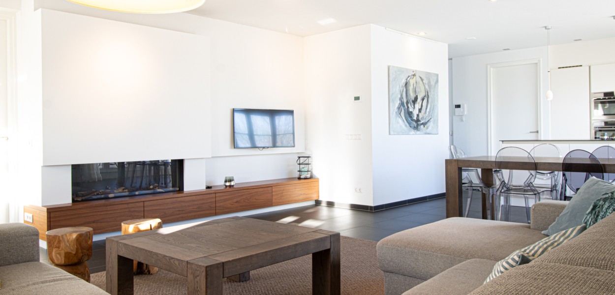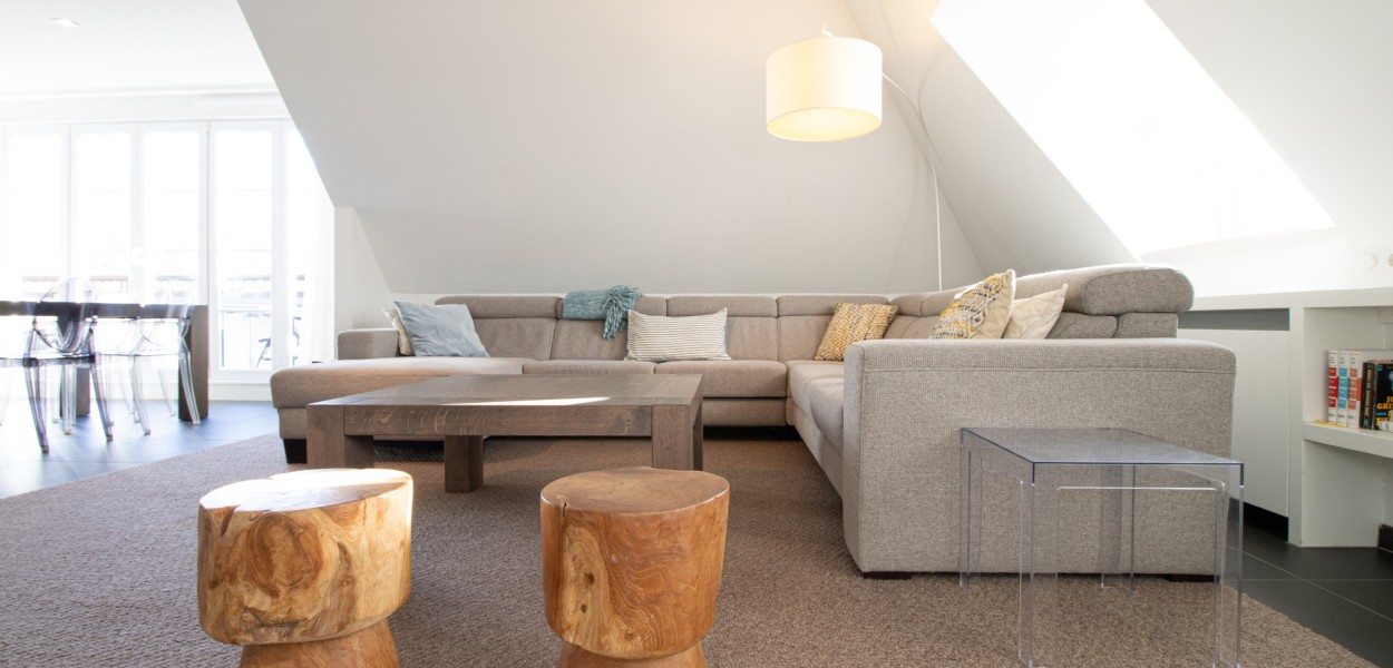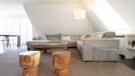 Im dritten Stock befindet sich dieses moderne, luxuriöse und vor allem sonnige Penthouse mit 132 m². Mit drei großen Schlafzimmern und zwei Bädern ist diese Wohnung für acht Personen hervorragend geeignet und auch Ihr Haustier ist wilkommen. Die Fensterfront an der Südseite öffnet sich auf einen wunderschönen Balkon mit herrlicher Aussicht auf die Umgebung. Einzigartig ist auch der behagliche Gasofen im Wohnzimmer.