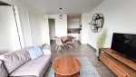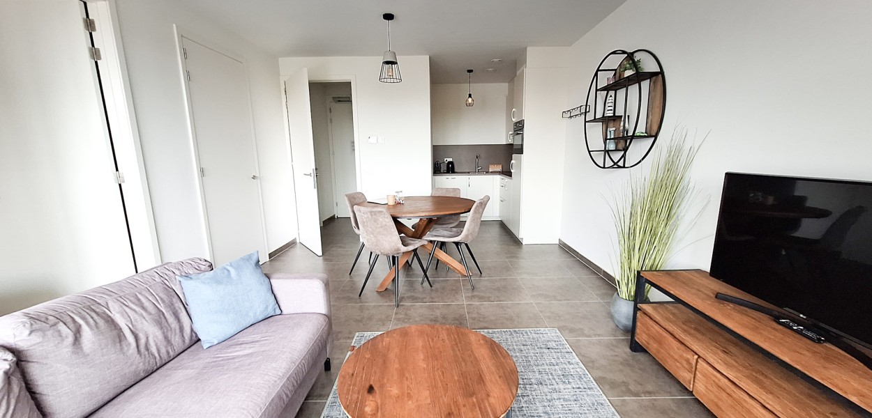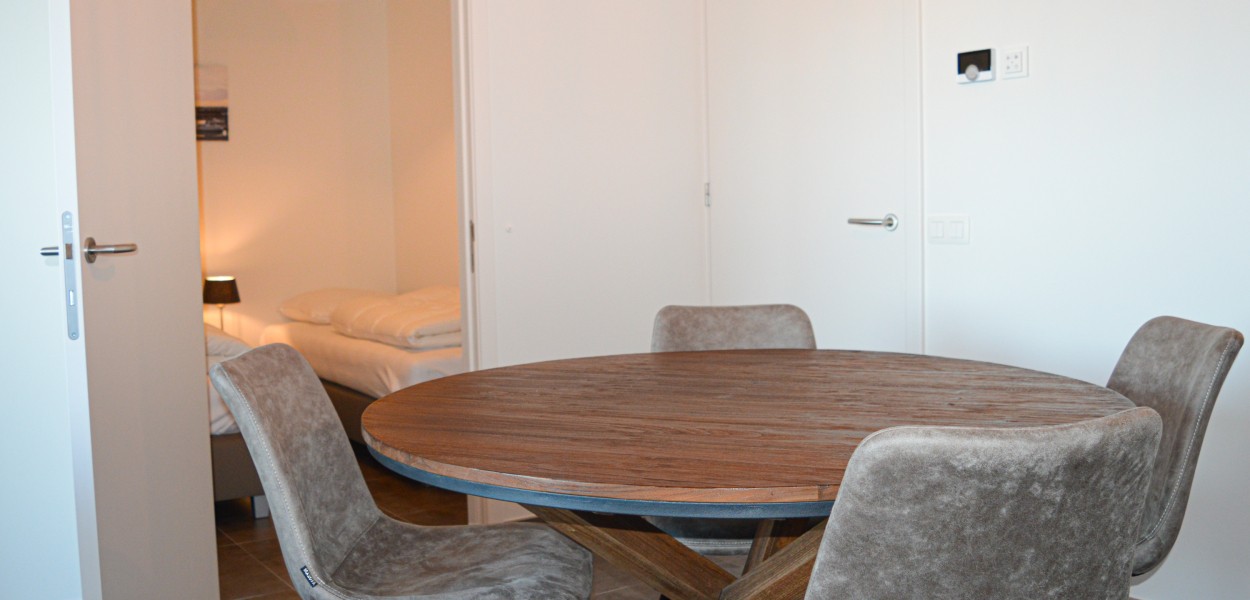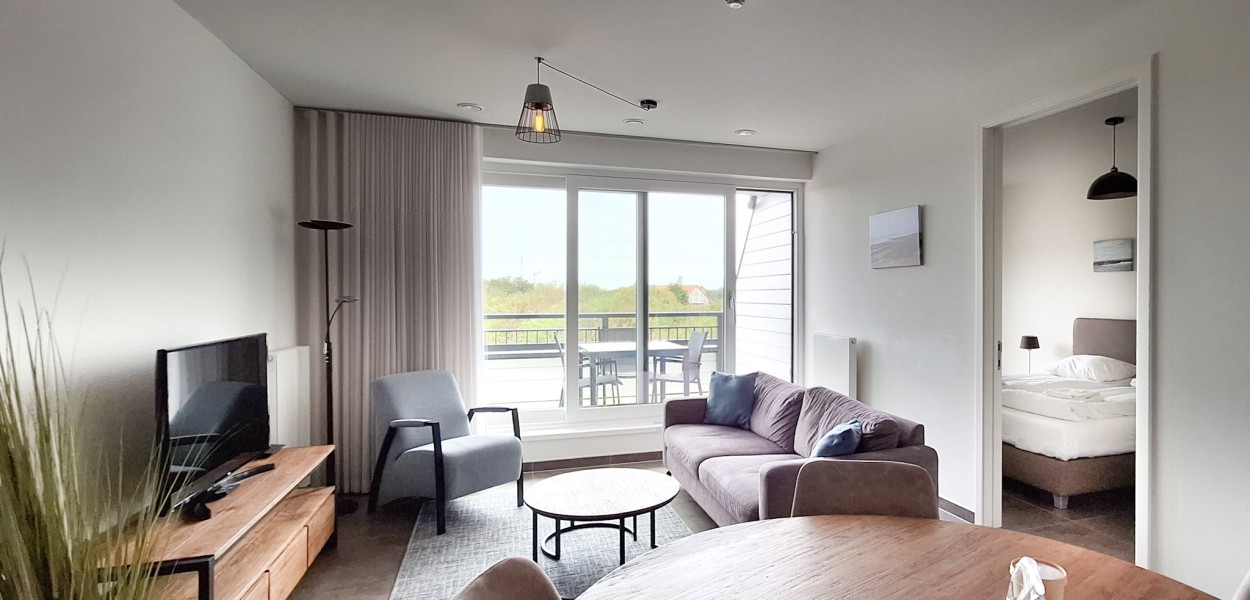 Der Wohnraum umfasst eine gemütliche Sitzecke mit Fernseher mit zusätzliche Deutsche Sender und einen gemütlichen runden Esstisch für 4 Personen. Die Küche ist kompakt und verfügt über eine Nespresso-Maschine, Induktionskochfeld, Kombi-Mikrowelle, Kühlschrank mit Gefrierfach und einen Geschirrspüler. Durch die Schiebetür kommen Sie vom Wohnzimmer auf dem Ostbalkon, von wo aus Sie die Dünen von Cadzand und die Nordsee genießen können. Der Balkon ist eingebaut und möbliert, so dass Sie zu jeder Jahreszeit dort bleiben können.