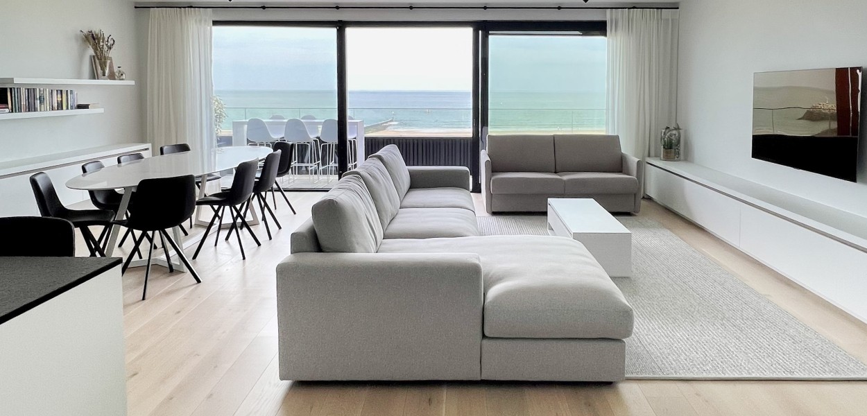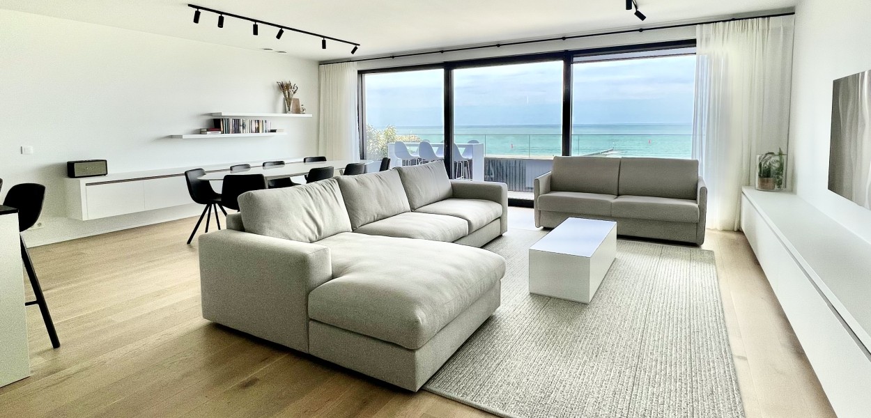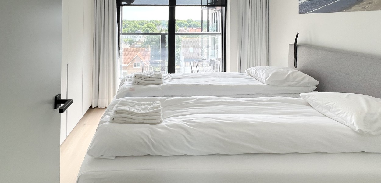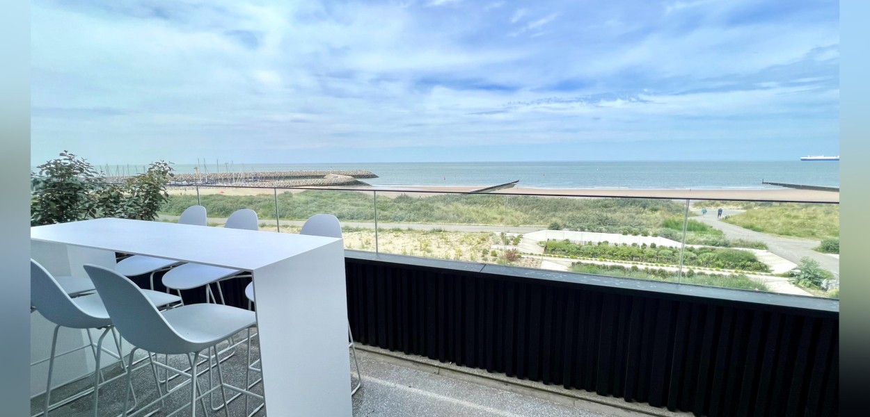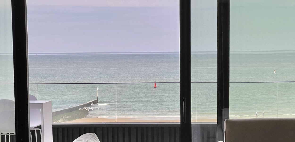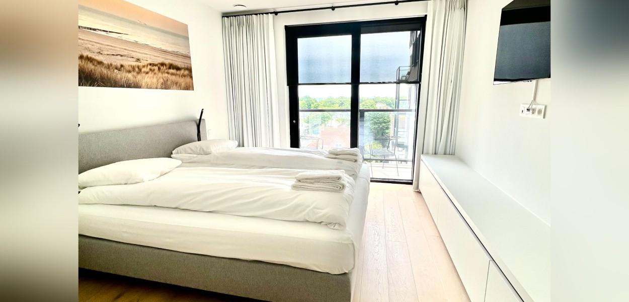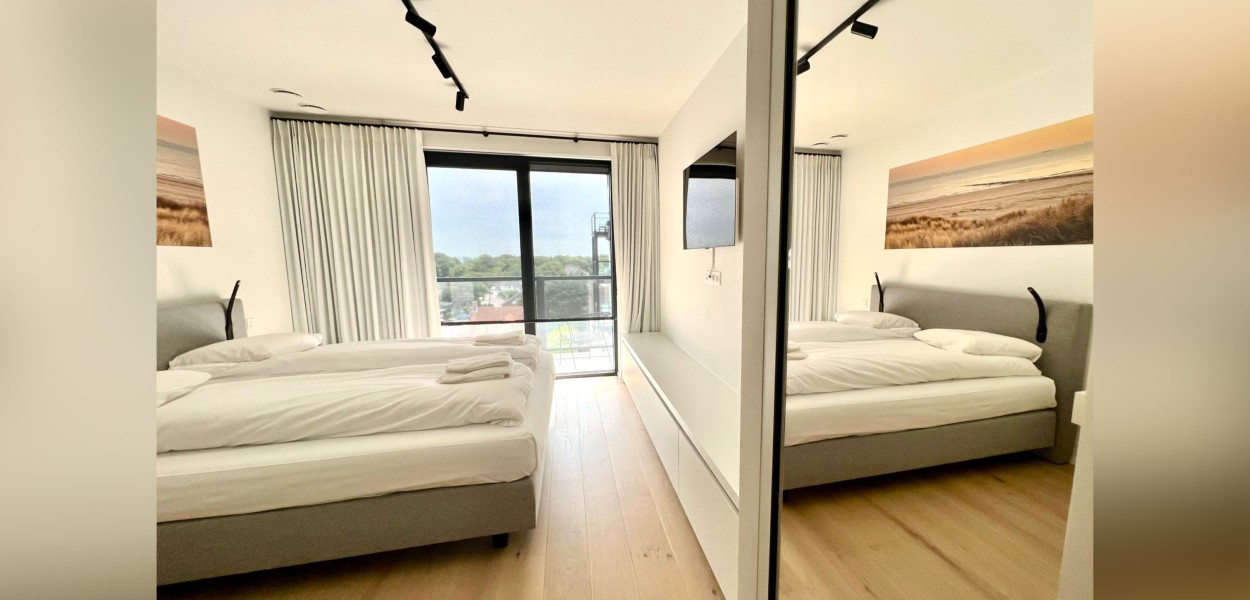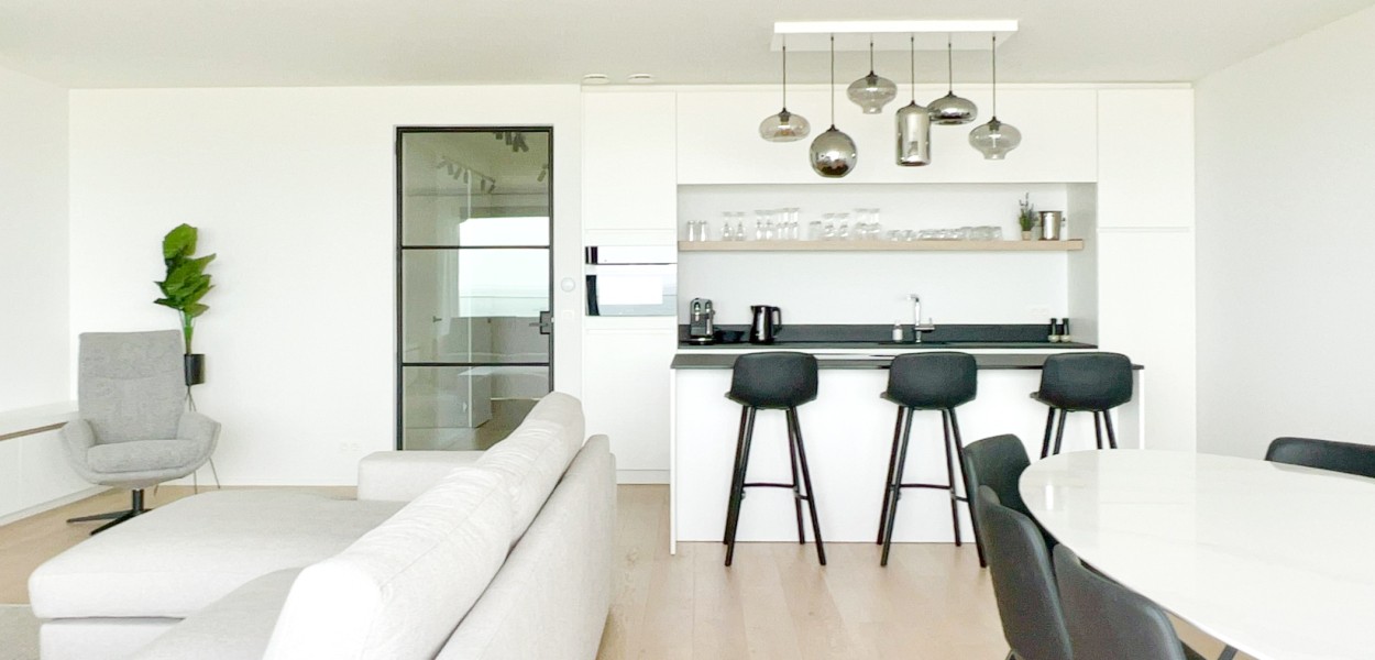 Der Wohnbereich besteht aus einem geräumigen, sehr modern eingerichteten Wohnzimmer, einer praktischen Küche und einem Essbereich, von dem Sie einen fantastischen Blick über die Dünen und das Meer genießen können. Das Wohnzimmer verfügt über eine gemütliche Sitzecke mit Fernseher, auf dem ein umfangreiches Programmpaket angesehen werden kann, und Schiebetüren, die sich zum Balkon öffnen. Zurück im Inneren finden Sie einen Essbereich mit einem schönen ovalen Esstisch mit 8 Stühlen, der den Wohnbereich bequem mit der offenen Küche verbindet. Die Küche hat eine gemütliche Kochinsel mit 3 Barhockern, wo Sie auf Induktion kochen. Es gibt auch eine Nespresso-Maschine, Kombi-Mikrowelle, einen Kühlschrank mit Gefrierfach und einen Geschirrspüler. Darüber hinaus steht Ihnen ein äußerst komplettes Inventarpaket zur Verfügung.