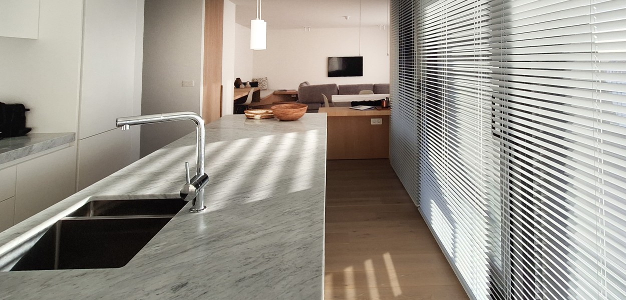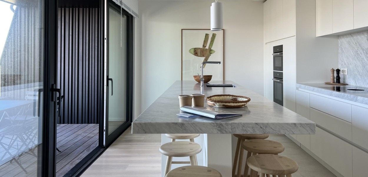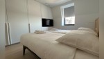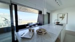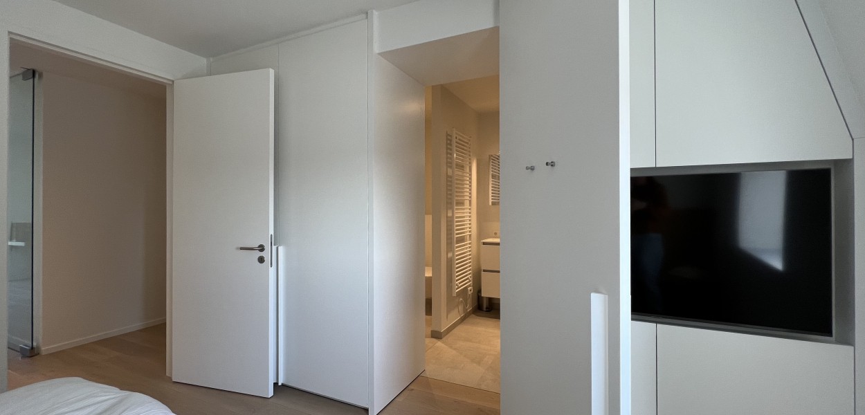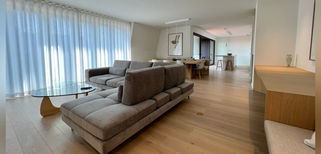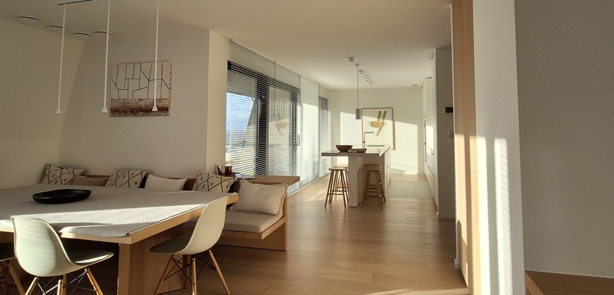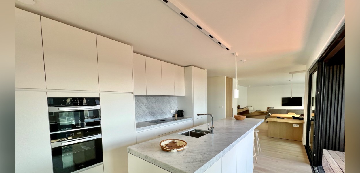 Der Wohnbereich besteht aus einem großzügigen Wohnzimmer, einer praktischen Küche mit Kochinsel und einem gemütlichen Essbereich. Das Wohnzimmer verfügt über eine gemütliche Sitzecke mit Fernseher, auf dem ein umfangreiches Senderpaket angesehen werden kann, und eine große Schiebetür, die sich zum Balkon öffnet. Zurück im Inneren finden Sie einen Essbereich mit einem gemütlichen Esstisch mit 8 Stühlen, der den Wohnbereich bequem mit der offenen Küche verbindet. Die Küche ist mit einer Nespresso-Maschine, Kombi-Mikrowelle, einem Kühlschrank mit Gefrierfach und einem Geschirrspüler ausgestattet. Sie kochen auf Induktion und verfügen über ein äußerst komplettes Inventarpaket.