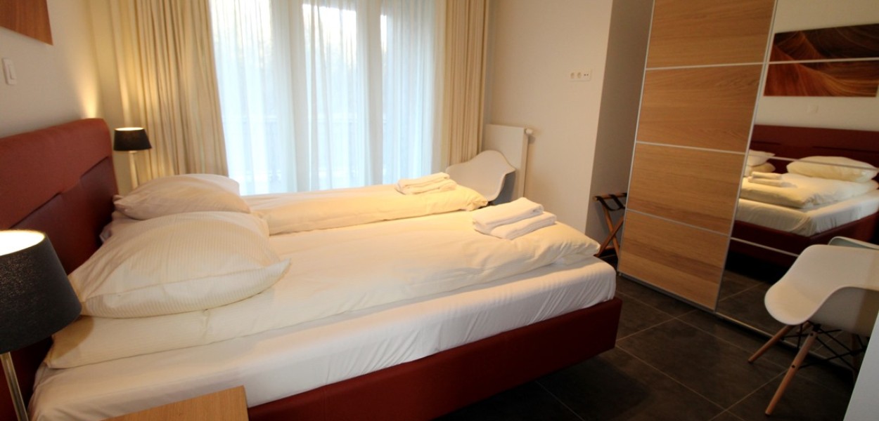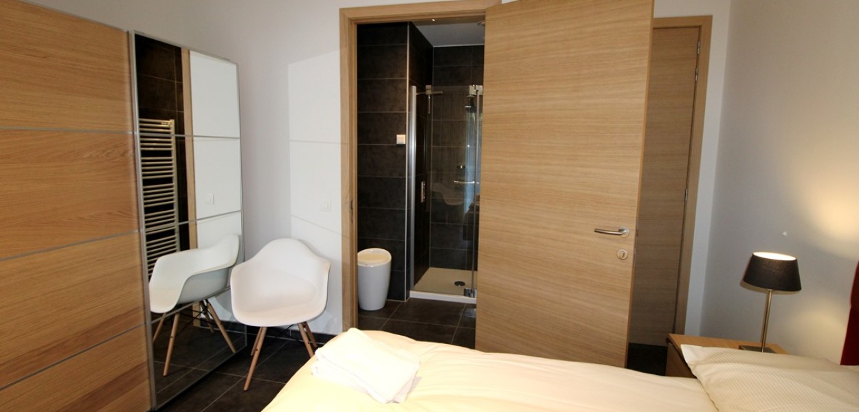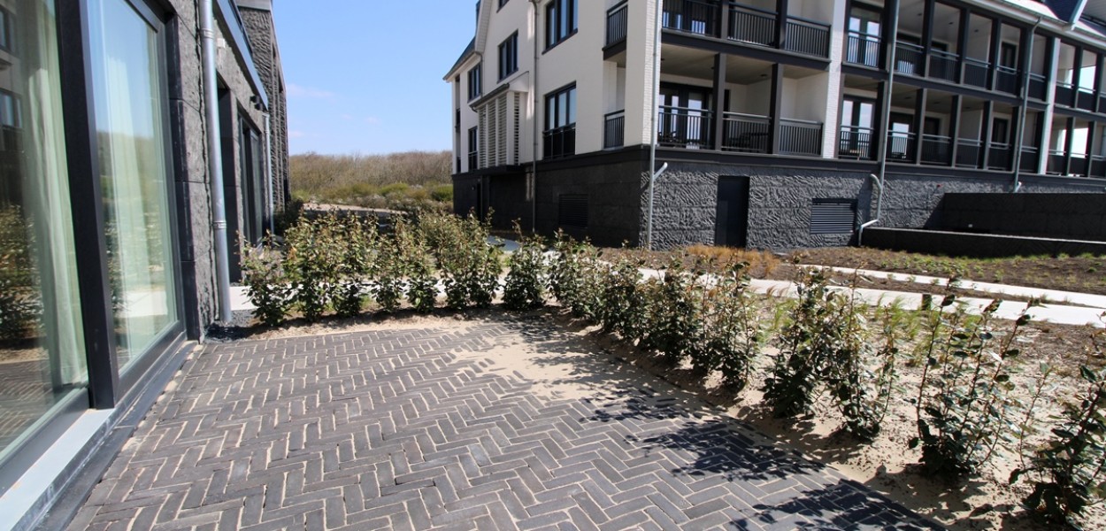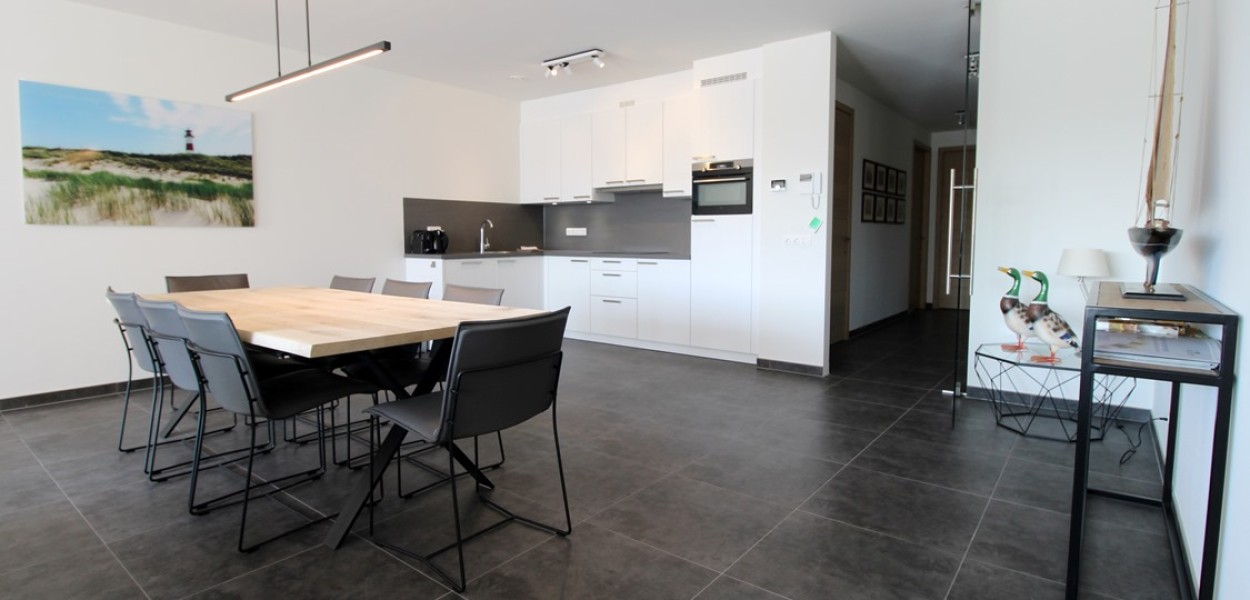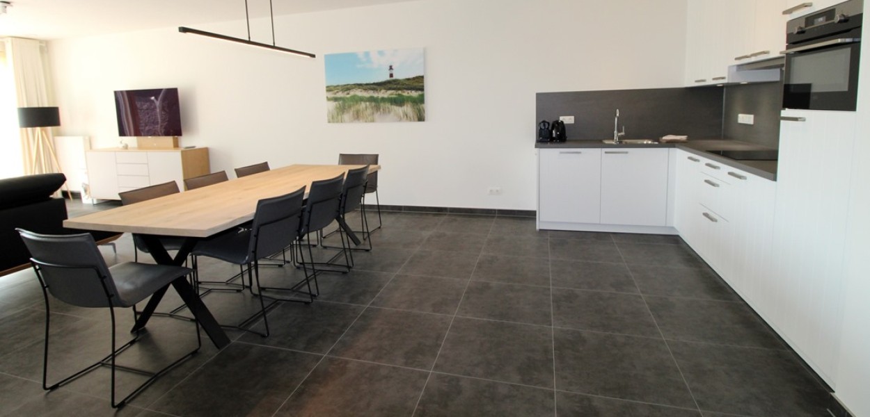 Der Wohnbereich blickt auf den Innenhof des Komplexes mit dahinter den Duinplein und ist hübsch eingerichtet mit einer komfortablen Sitzecke mit Fernseher, in der ein umfangreiches digitales Senderprogramm programmiert wurde. Der Essbereich umfasst einen schönen großen Esstisch, ideal für ein schönes Abendessen oder ein Spiel. Die offene Küche ist komplett ausgestattet und verfügt über einen Induktionsherd, eine Mikrowelle, einen Kühlschrank mit Gefrierfach, eine Nespresso-Kaffeemaschine und einen Geschirrspüler.