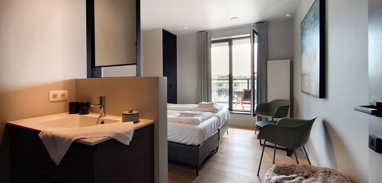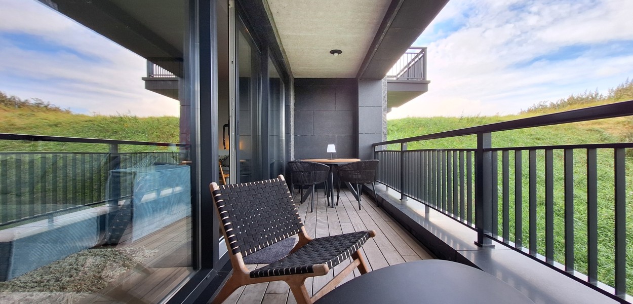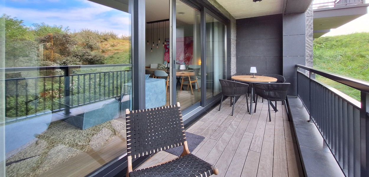 Im Wohnbereich gibt es eine gemütliche Sitzecke, die über einen Fernseher mit einem umfangreichen digitalen Kanalpaket verfügt. Der Essbereich umfasst einen wunderbar großen Esstisch mit einem gemütlichen Sofa an der Wand. Die offene Küche bietet mehr als genug Stauraum und ist mit allen Annehmlichkeiten ausgestattet: Neben einem Induktionsherd finden Sie auch eine Kombi-Mikrowelle, einen Kühlschrank mit großem Gefrierfach, eine Nespresso-Maschine und einen Geschirrspüler. Durch die großen Schiebetüren betreten Sie den großzügigen Balkon, auf dem Sie sich mitten in der Natur befinden und die Ruhe und die Dünenlandschaft genießen.