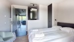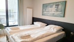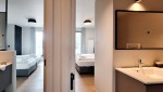 Beide Schlafzimmer verfügen über Boxspring-Kombinationen und bieten Zugang zum Südbalkon. Das große Badezimmer ist en suite zum Hauptschlafzimmer und ist mit einer geräumigen begehbaren Dusche, einem Doppelwaschbecken und einer Toilette ausgestattet. Das zweite Badezimmer, das in das andere Schlafzimmer integriert ist, umfasst eine ebenerdige Dusche und ein Waschbecken. Im Flur befindet sich auch ein separates WC sowie ein praktischer Abstellraum mit Waschmaschine und Trockner.