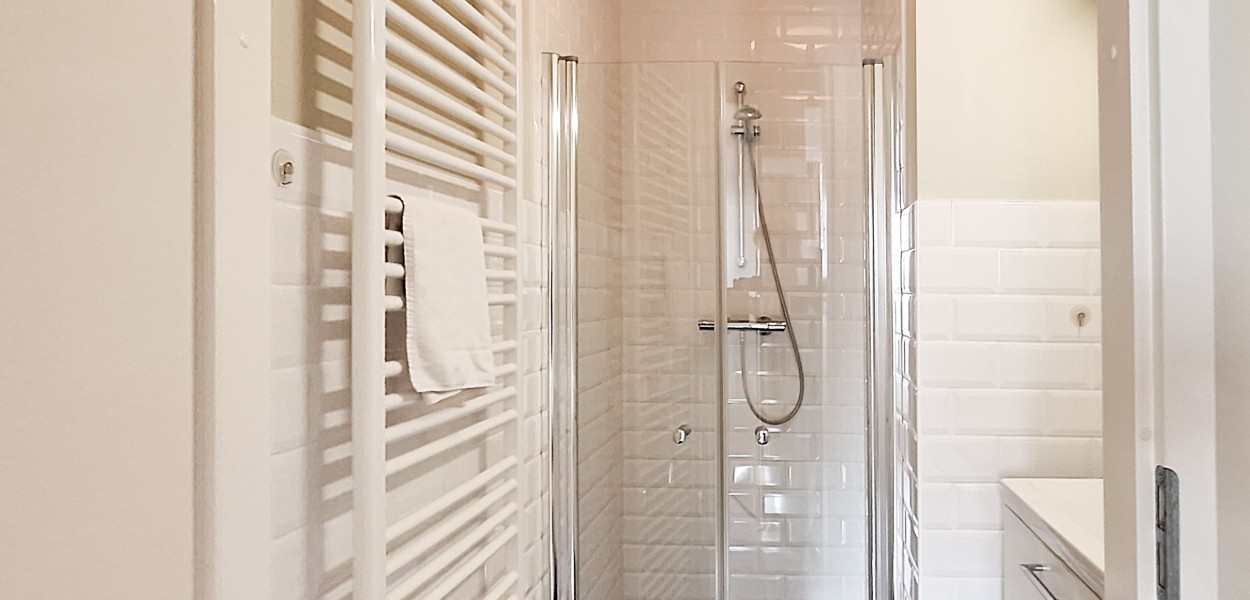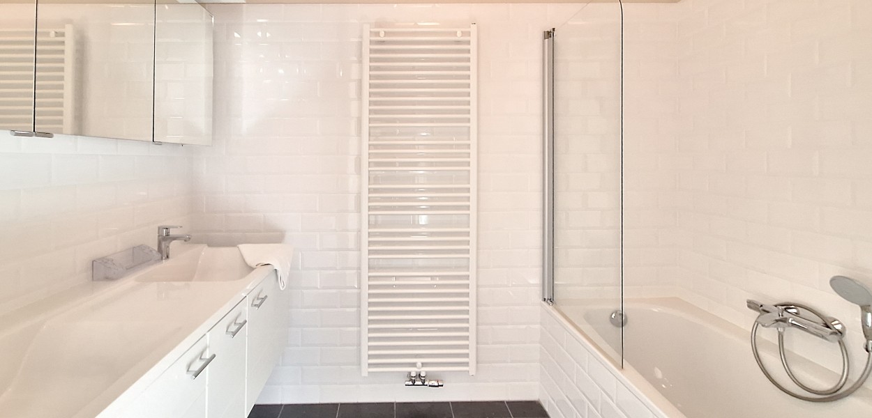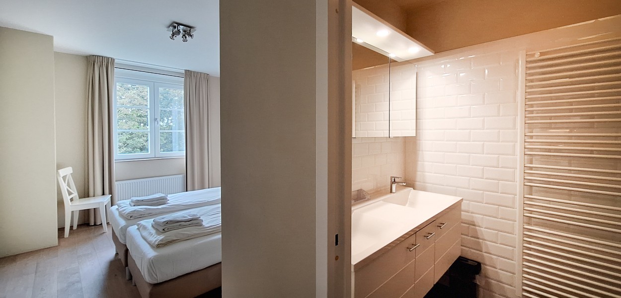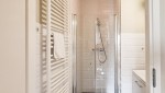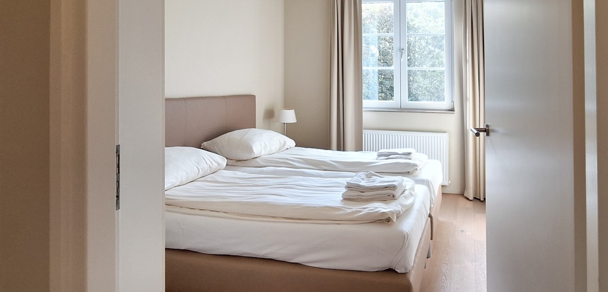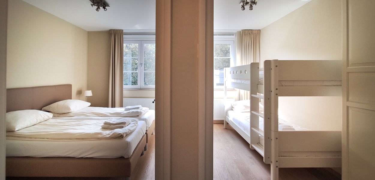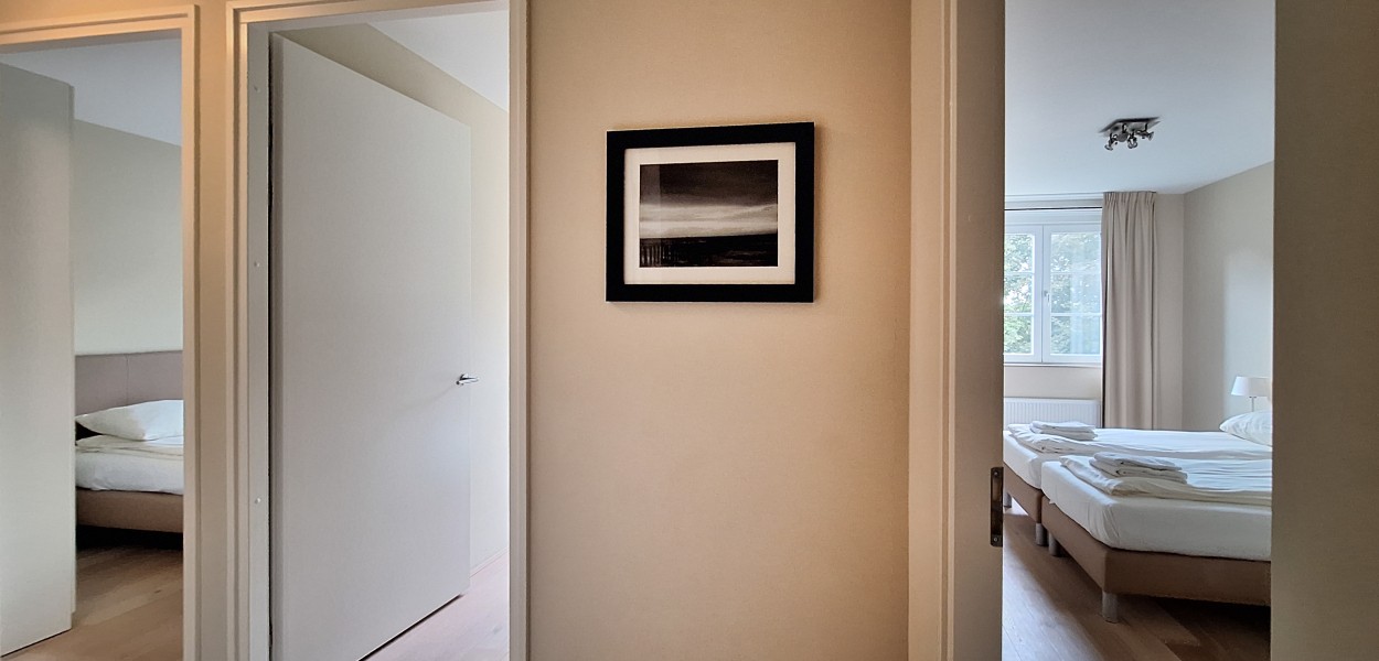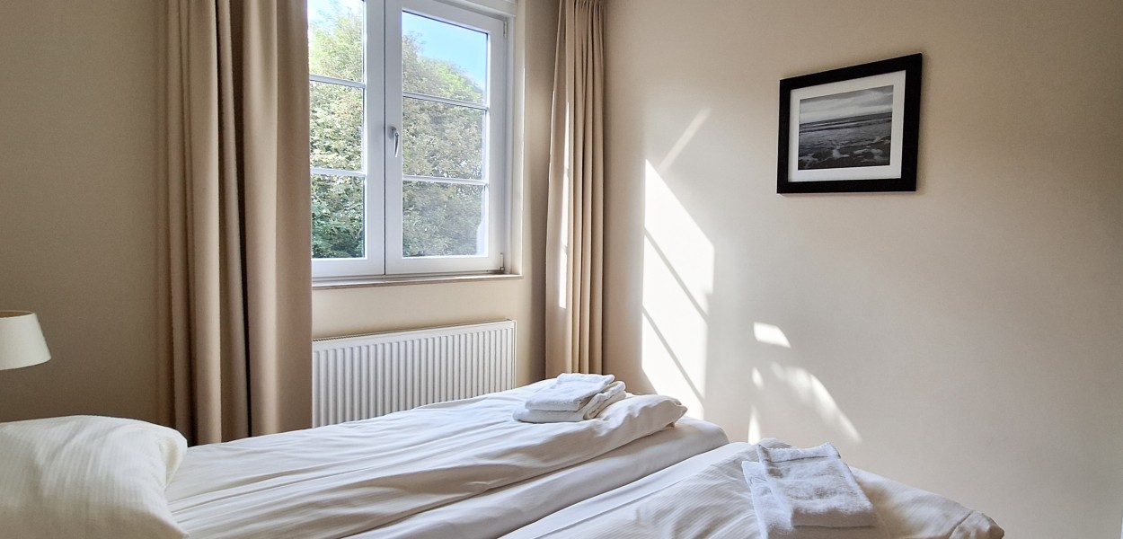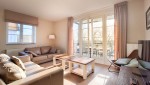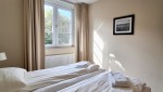 Die drei Schlafzimmer sind elegant und behaglich eingerichtet. In beiden Zimmer schlafen Sie auf hochwertigen Boxspringbetten. Das dritte Schlafzimmer ist mit einem soliden Etagenbett ausgestattet. Die beiden Bäder sind unterschiedlich eingerichtet. Das eine verfügt über eine Badewanne und zwei Waschbecken, das andere mit bequemer, begehbarer Dusche und Waschbecken. Die Toilette ist im Eingangsbereich untergebracht, ebenso wie ein praktischer Abstellraum mit Waschmaschine und Trockner.