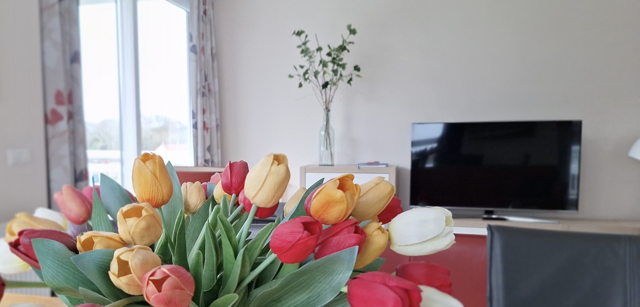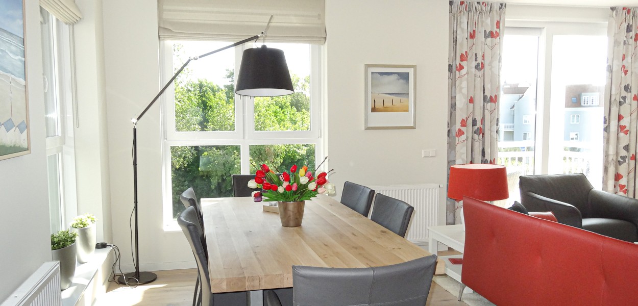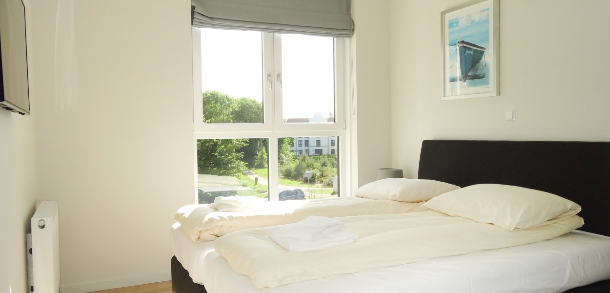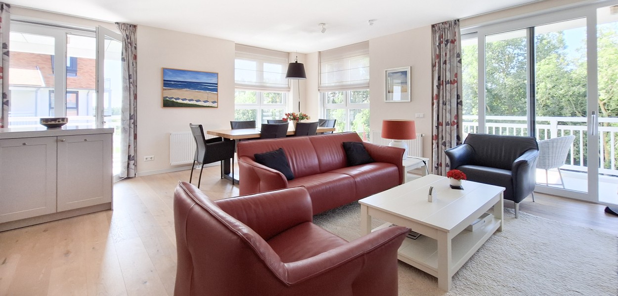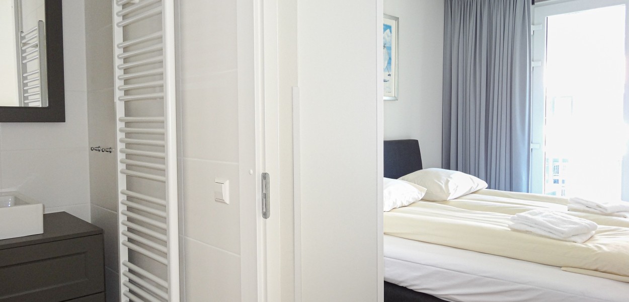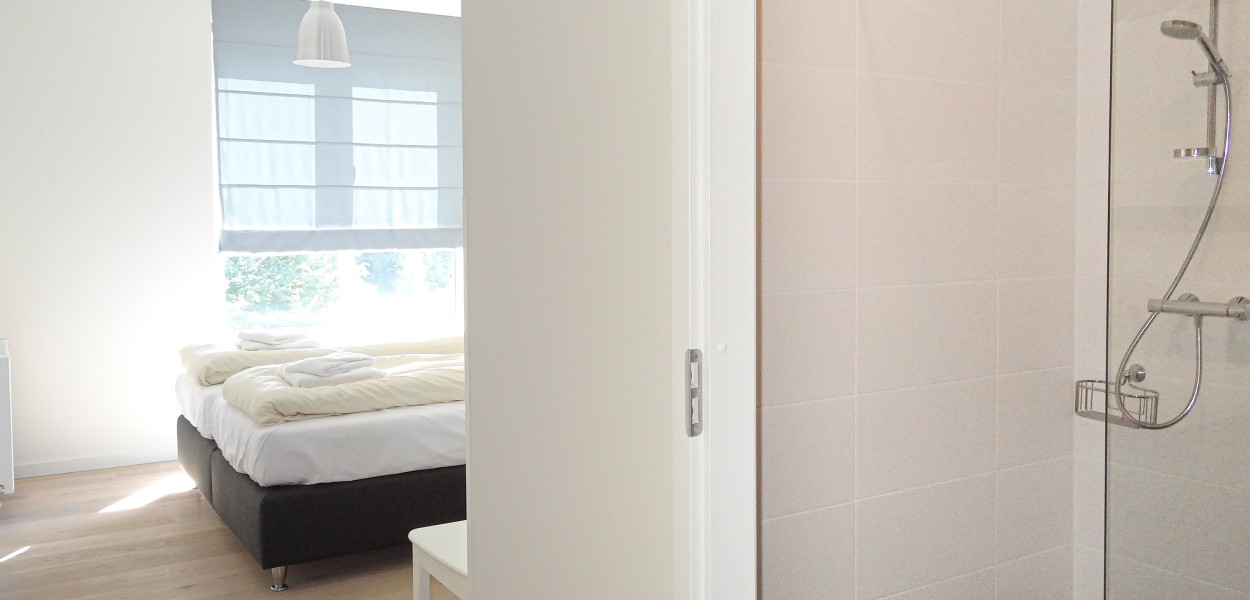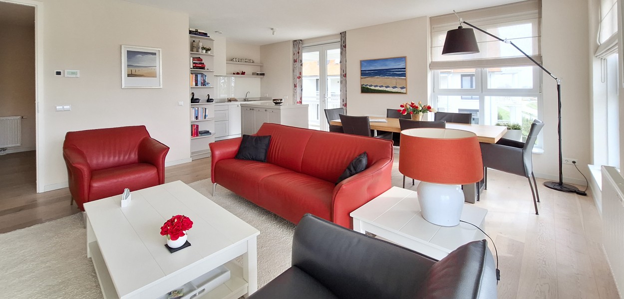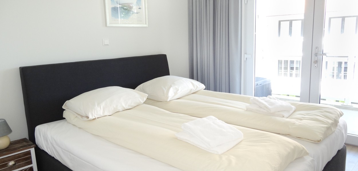 Der geräumige Wohnbereich umfasst das Wohnzimmer mit schönen Sitzecke und Fernseher und eine gemütliche Essecke. Im Anschluss ist die offene Küche, die mit ein Nespresso Maschine, eine kleine Filterkaffeemaschine, einem Induktionsherd, Mikrowelle, Kühlschrank mit Gefrierfach und einem Geschirrspüler ausgestattet ist. Diese Vier-Personen-Wohnung verfügt über 2 identische Schlafzimmer, beide mit Luxus-Boxspring-Kombinationen. Beide Bäder verfügen über eine Dusche und ein Waschbecken, in eine davon auch ein 2e Toilette. Ein Haartrockner ist standardmäßig vorhanden. Eine separate Toilette in der Halle sowie ein praktischer Abstellraum mit Waschmaschine und Trockner finden Sie im Flur.
