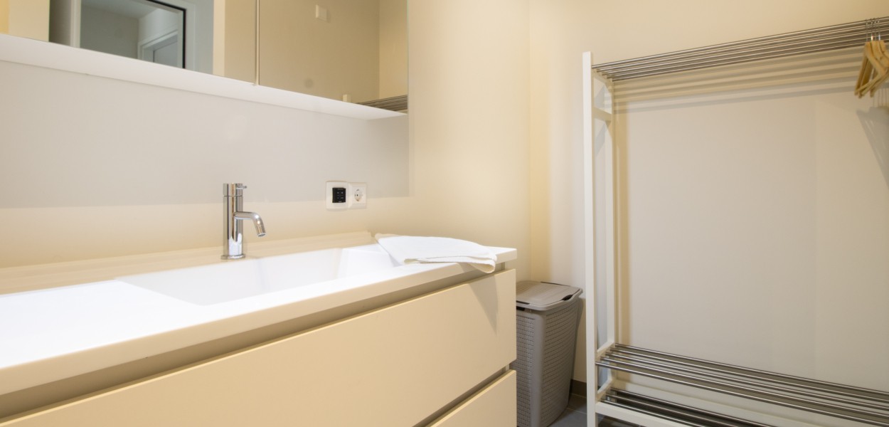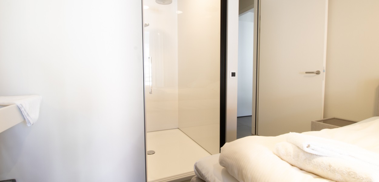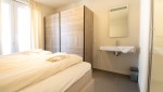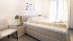 Die offene Küche ist durch die Spülinsel und den zusätzlichen Stauraum besonders geräumig. Außerdem gibt es dort einen Induktionsherd, eine Kombi-Mikrowelle, einen Kühlschrank mit Eisfach und einen Geschirrspüler. Das gemütliche Wohnzimmer verfügt über eine kuschelige Sitzecke mit TV-Gerät (TV Basis Paket) sowie einen Blu-ray-Player. Beide Schlafzimmer haben mit den komfortablen Boxspringbetten ein sehr ansprechendes Ambiente. Die beiden Bäder sind unterschiedlich eingerichtet. Eines verfügt über eine begehbare Dusche mit Eco-Regenduschkopf, Doppelwaschbecken und WC. Das zweite hat eine begehbare Dusche und ein Waschbecken. Eine weitere Toilette sowie eine praktische Abstellkammer mit Waschmaschine und Trockner finden Sie auf dem Flur.