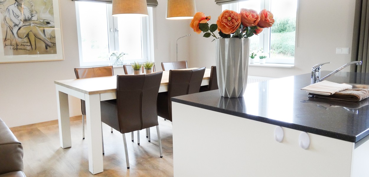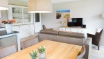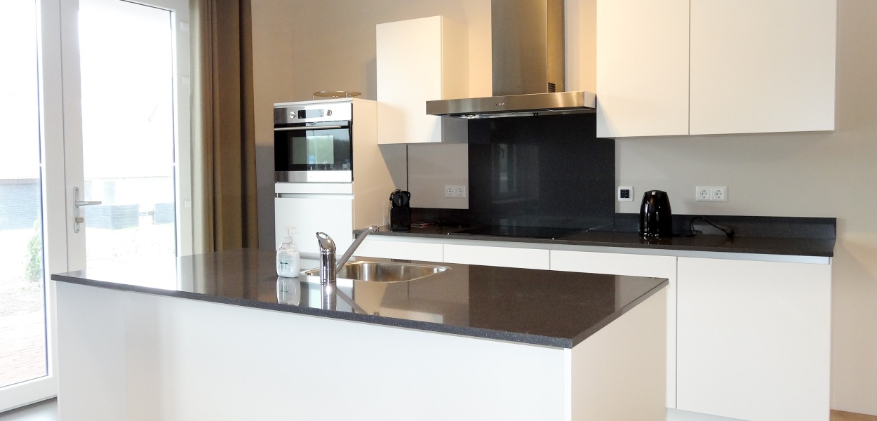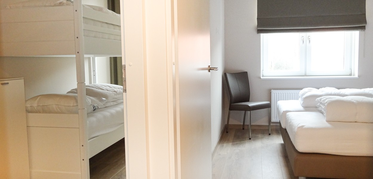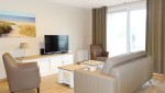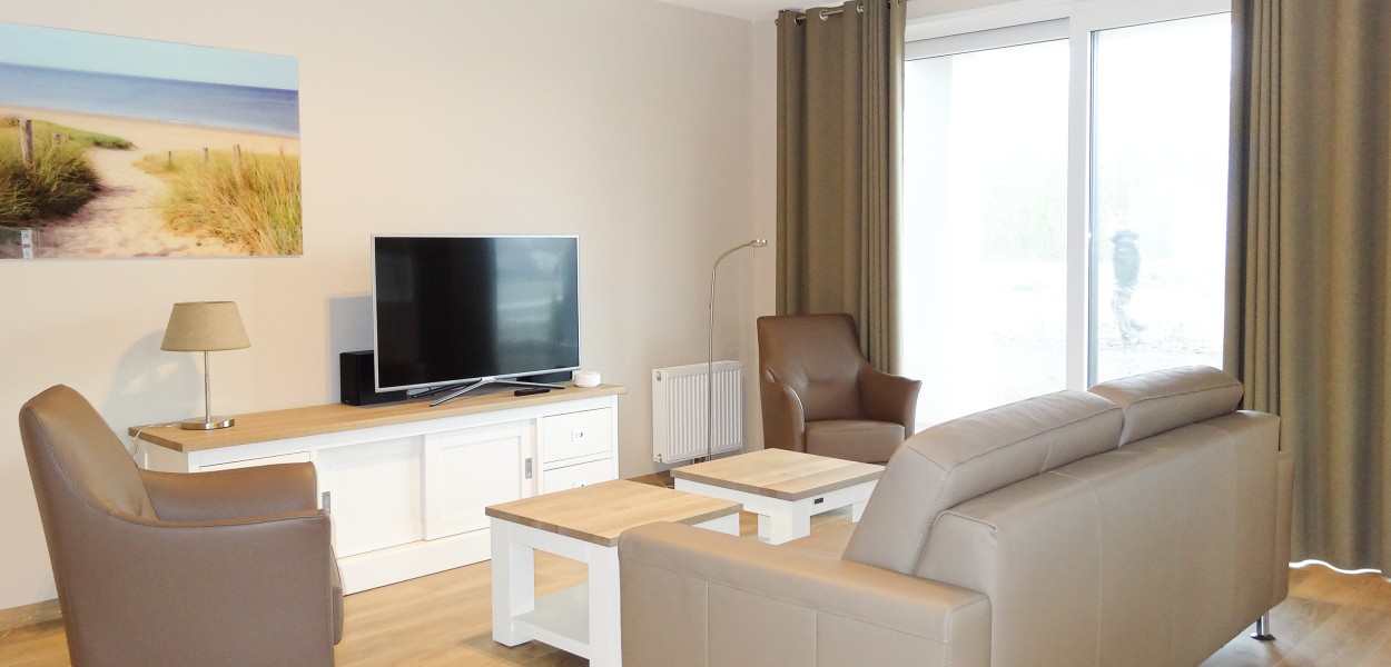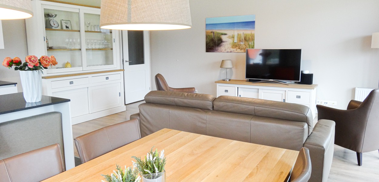 Im Wohnzimmer mit Gartentüren auf die beiden Terrassen gibt es eine gemütliche Sitzecke und eine Essecke. Außer einem TV-Gerät mit umfassendem digitalem Senderpaket steht für Sie auch ein DVD-Player zur Verfügung. Ebenso findet sich im Elternschlafzimmer ein TV-Gerät mit digitalen Sendern. Die luxuriöse offene Küche mit Spülinsel verfügt über Kombi-Mikrowelle, Kühlschrank, Nespresso-Maschine und Geschirrspüler. Dieses Apartment hat 3 Schlafzimmer und bietet Raum für 6 Personen. Die beiden großen Schlafzimmer sind mit luxuriösen Boxspringbetten ausgestattet, das dritte Zimmer mit einem stabilen Stockbett. Ein Hochstuhl ist vorhanden. Im Anschluss an das Elternschlafzimmer befindet sich das größere Badezimmer mit Dusche, Toilette und Waschbecken. Das zweite Bad befindet sich auf dem Flur und verfügt über Dusche und Doppelwaschbecken. Ein Haartrockner ist vorhanden. Eine separate Toilette gibt es ebenfalls auf dem Flur, ebenso wie eine praktische Abstellkammer mit Tiefkühler, Waschmaschine und Trockner.