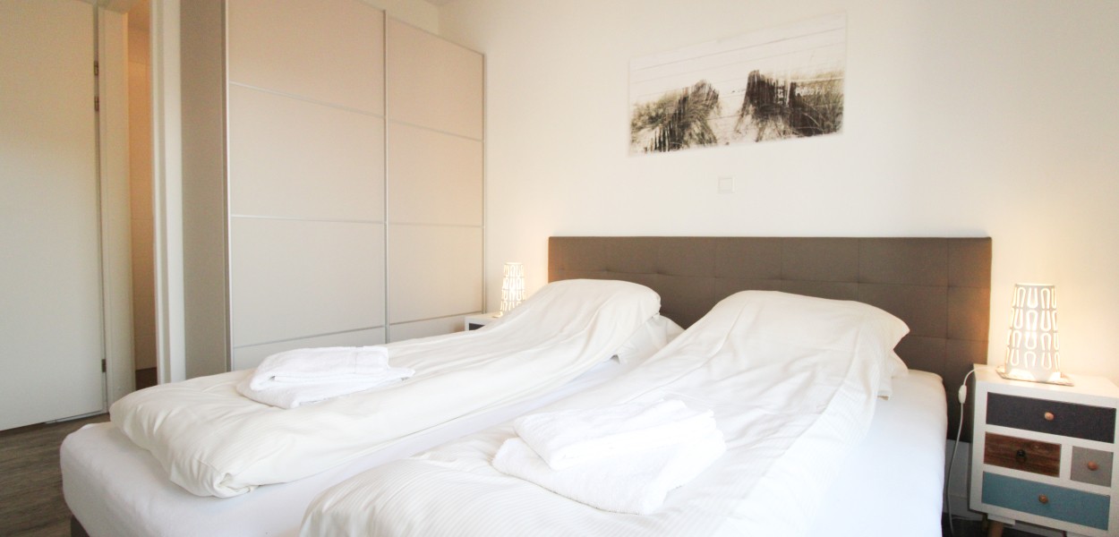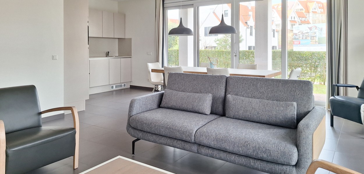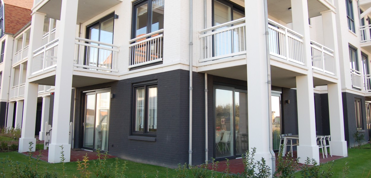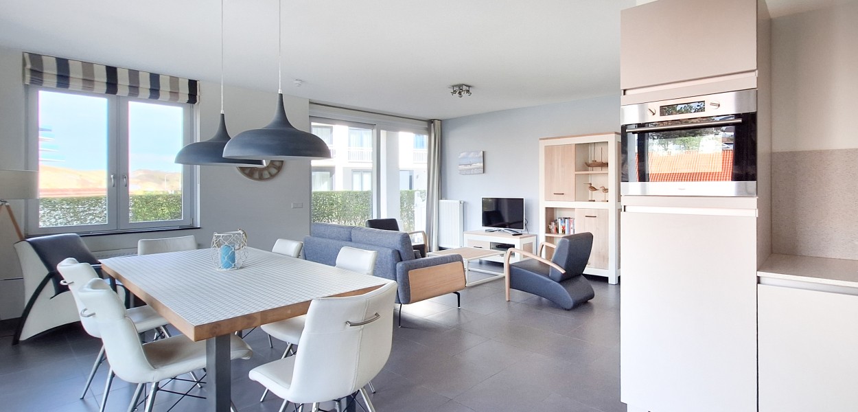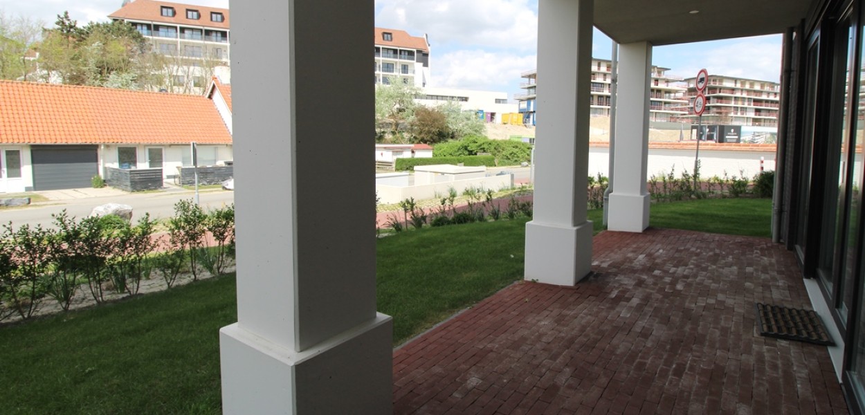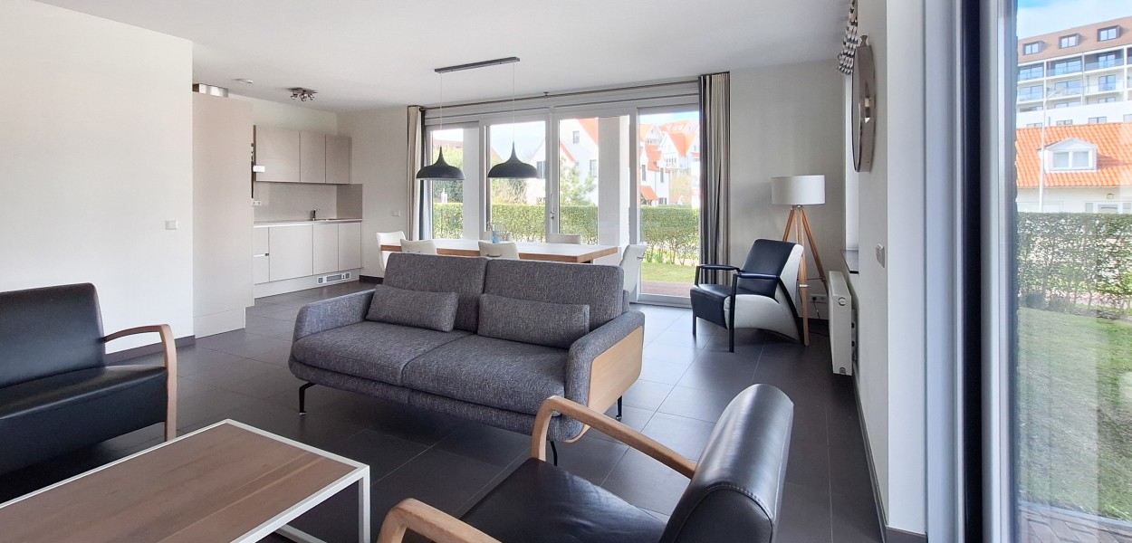 Ein großzügiges, ebenerdiges Apartment mit 89 m² und zwei Schlafzimmern. Die Gartentüren öffnen sich zu einem 75m²-Garten mit zwei getrennten Terrassen, von denen aus Sie auf den Boulevard bzw. die Dünen sehen.