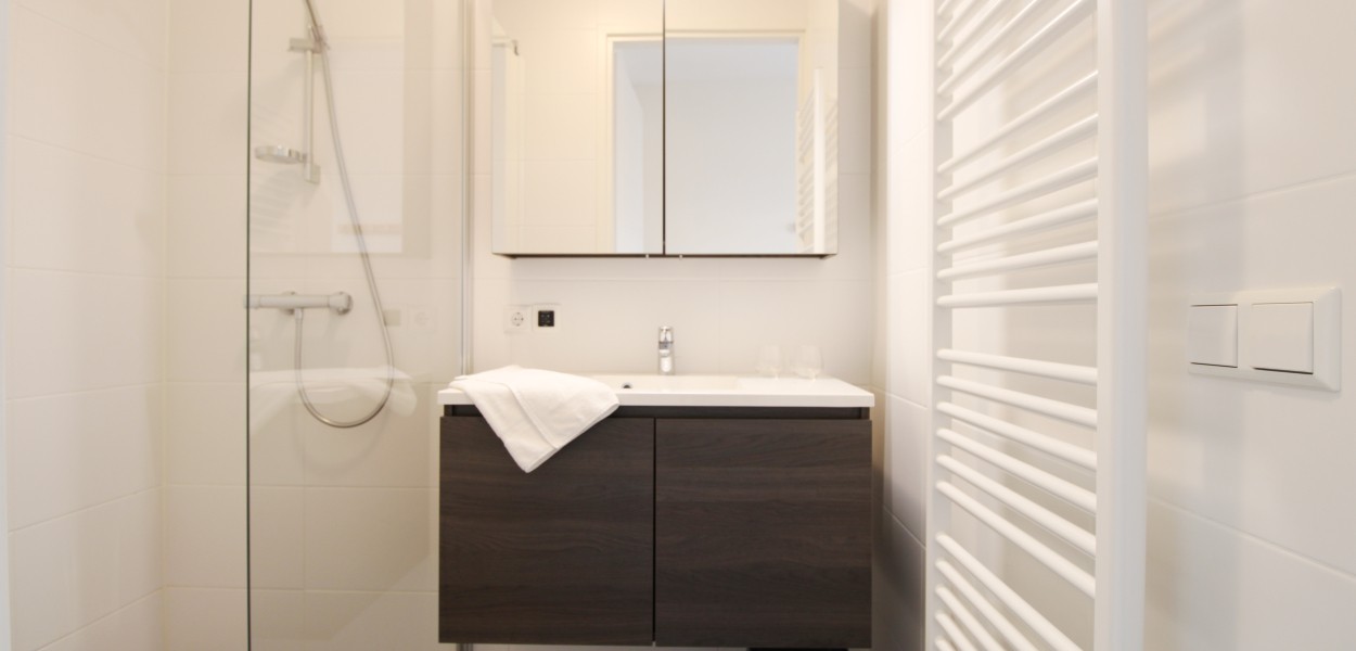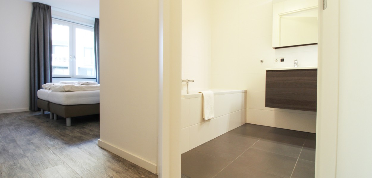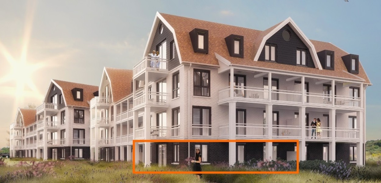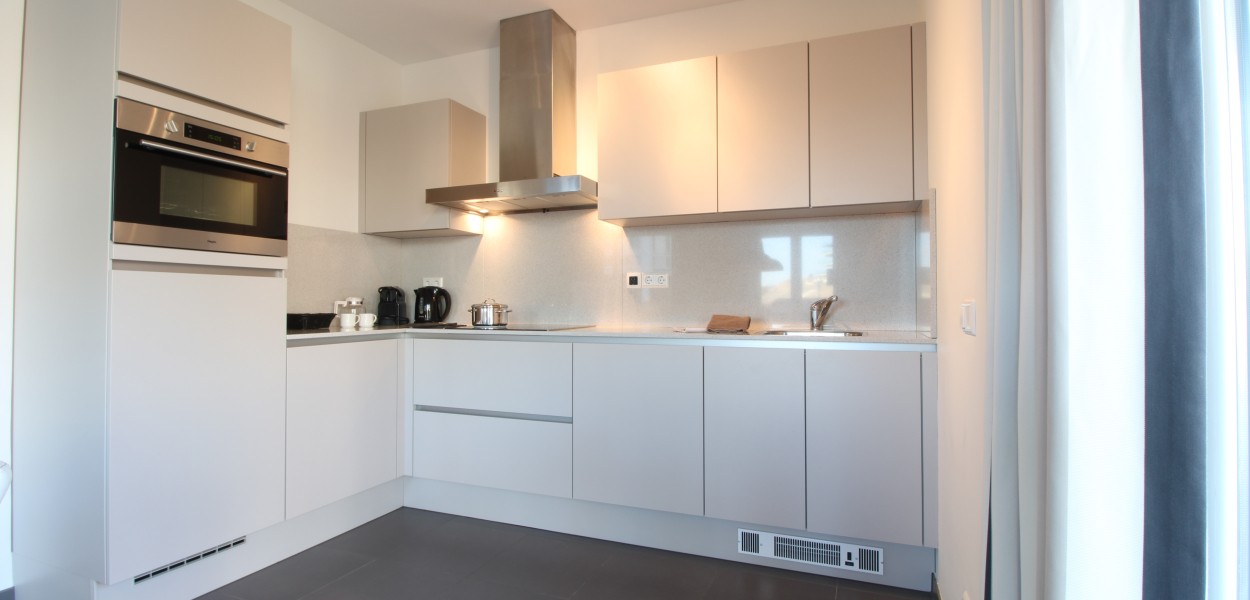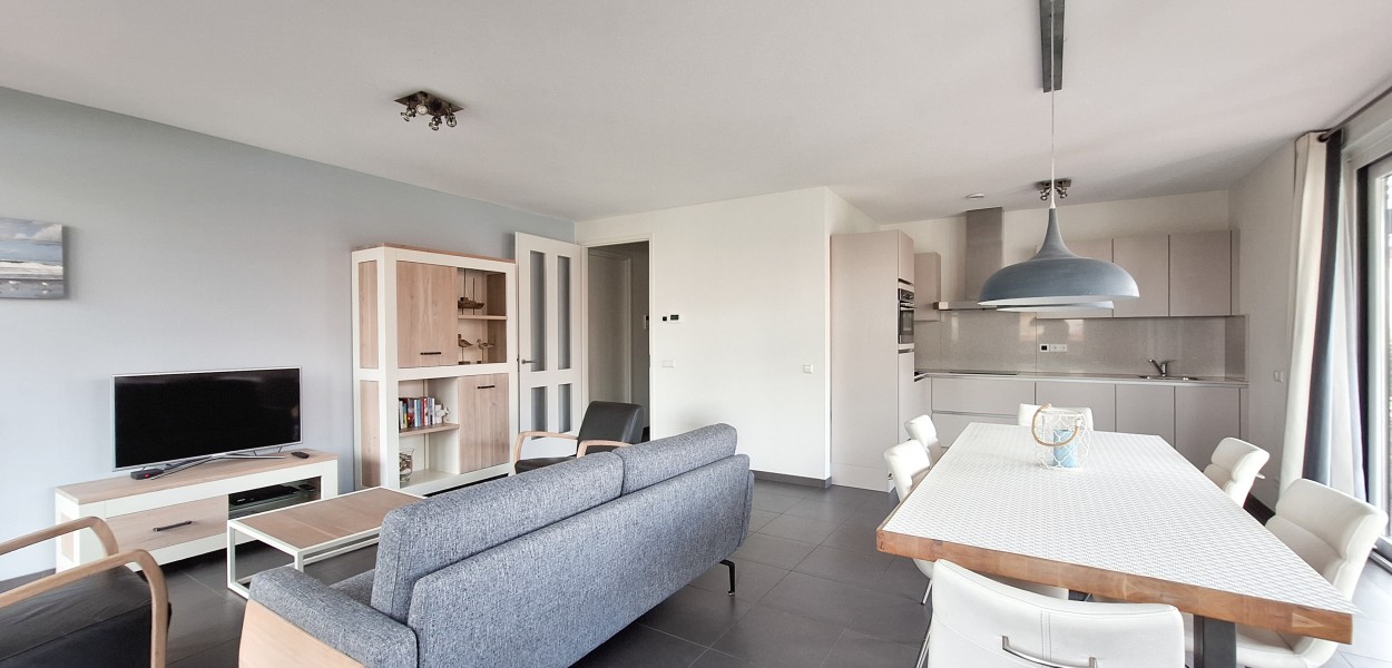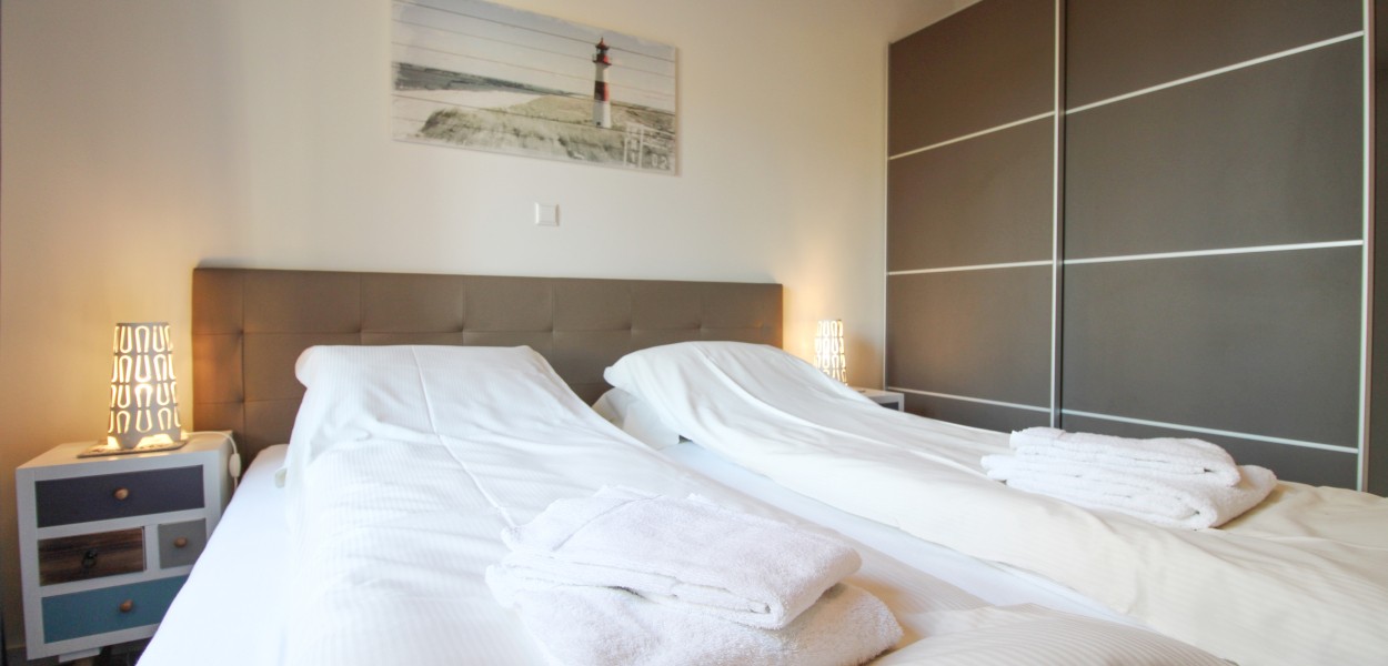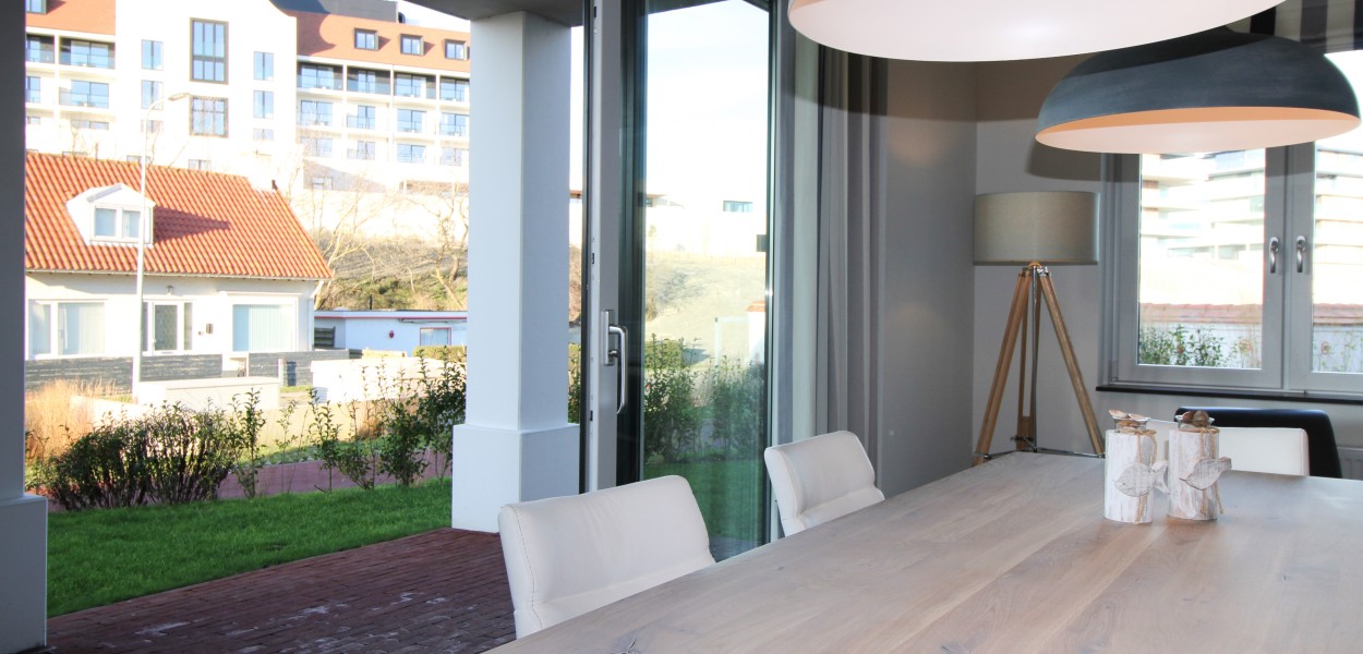 Ein großzügiges, ebenerdiges Apartment mit 89 m² und zwei Schlafzimmern. Die Gartentüren öffnen sich zu einem 75m²-Garten mit zwei getrennten Terrassen, von denen aus Sie auf den Boulevard bzw. die Dünen sehen.