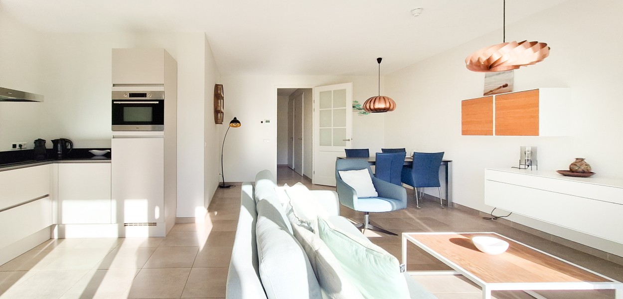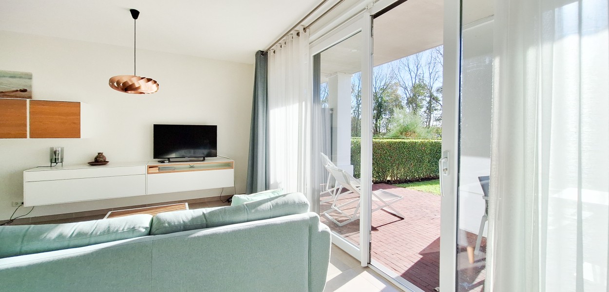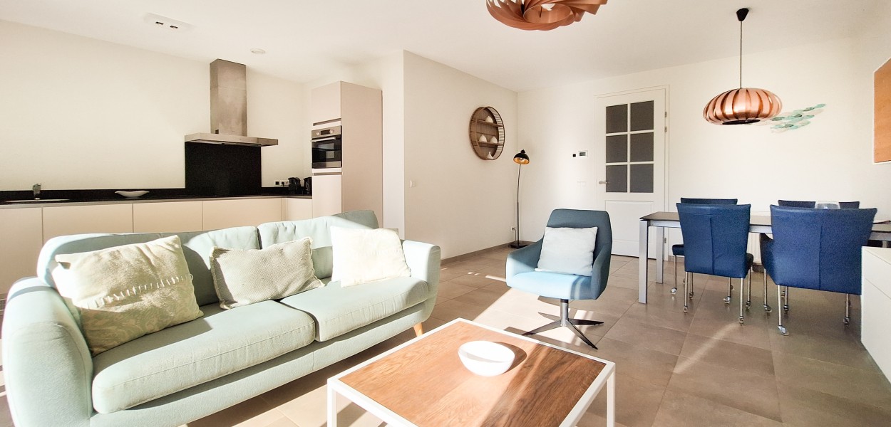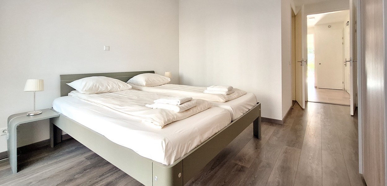 Im geräumigen Wohnzimmer gibt es neben einer komfortablen Sitzecke mit TV (basis paket)eine Essecke mit Aussicht auf den südwestlich gelegenen Garten. Die offene Küche ist mit allem Komfort ausgestattet und hat außer einem Induktionsherd auch eine Kombi-Mikrowelle, einen Kühlschrank, eine Nespresso-Maschine und einen Geschirrspüler. Das Elternschlafzimmer ist mit einem Auping Bett von 2,10 m Länge und einem geräumigen Kleiderschrank eingerichtet. Das Badezimmer verfügt über eine Dusche, ein Doppelwaschbecken sowie eine Toilette. Auf dem Flur gibt es einen praktischen Abstellraum mit Waschmaschine und Trockner.