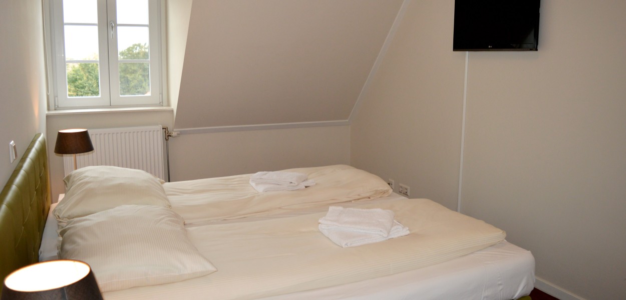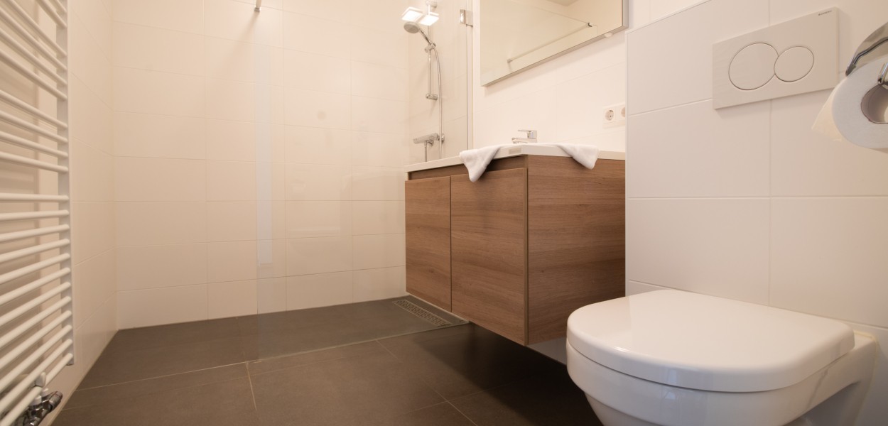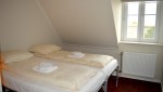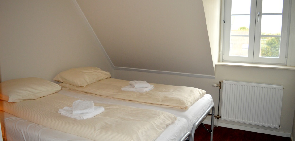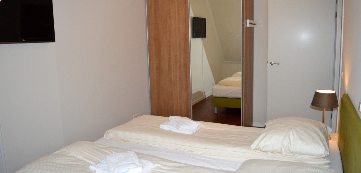 Das Elternschlafzimmer ist mit einem hochwertigen Boxspringbett, einem geräumigen Schrank sowie einem Fernsehgerät ausgestattet (inkl.Basis paket). Im zweiten Schlafzimmer gibt es zwei bequeme Einzelbetten. Das Badezimmer ist mit Waschbecken, großer begehbarer Dusche und Toilette eingerichtet. Eine weitere Toilette befindet sich im Flur, ebenso die praktische Abstellkammer mit Waschmaschine und Trockner.