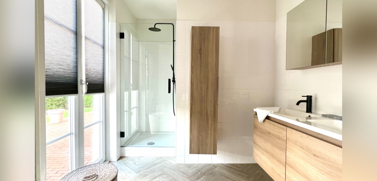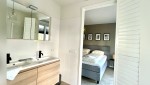 Das Hauptschlafzimmer ist elegant und komplett eingerichtet mit einer luxuriösen Boxspring-Kombination und einem geräumigen Kleiderschrank. Das geräumige Badezimmer ist mit einer angenehmen Dusche und ein Doppelwaschbecken ausgestattet. In der Halle gibt es eine Toilette sowie einen praktischen Abstellraum mit Waschmaschine.