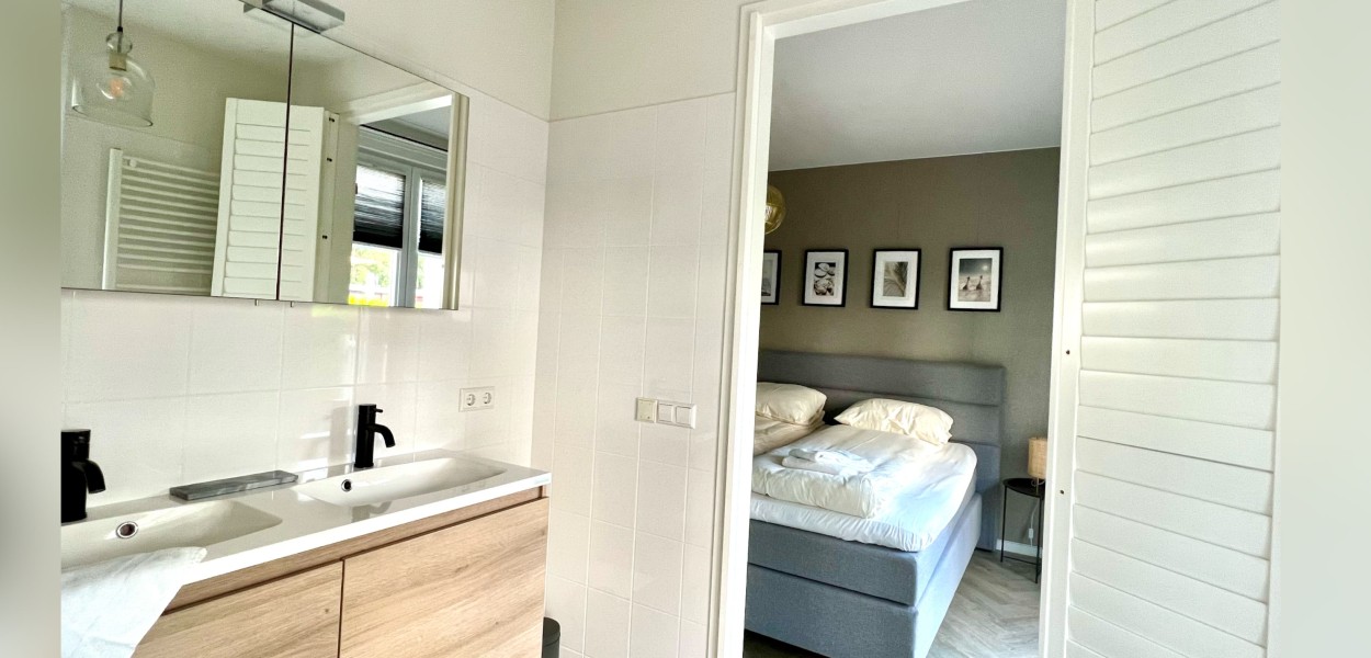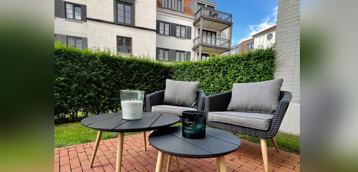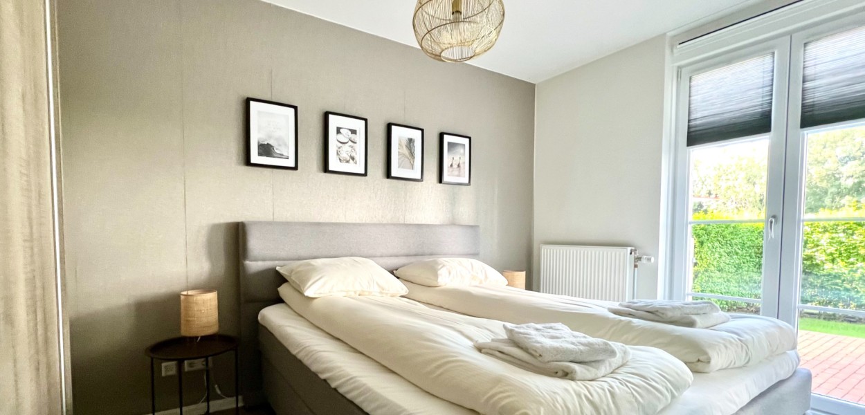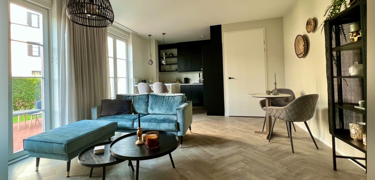 Die Kombination des gemütlichen Wohnzimmers mit der offenen Küche und den großen Terrassentüren zum Garten, die viel Licht spenden, machen diese Wohnung zu einem sehr angenehmen Ausgangspunkt für einen Urlaub an der Küste von Zeeland.