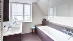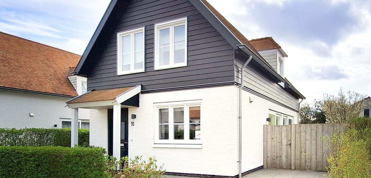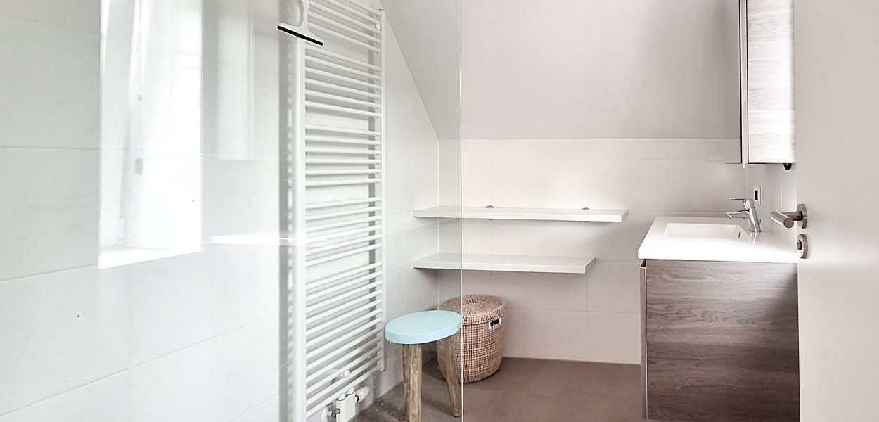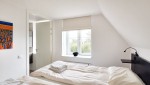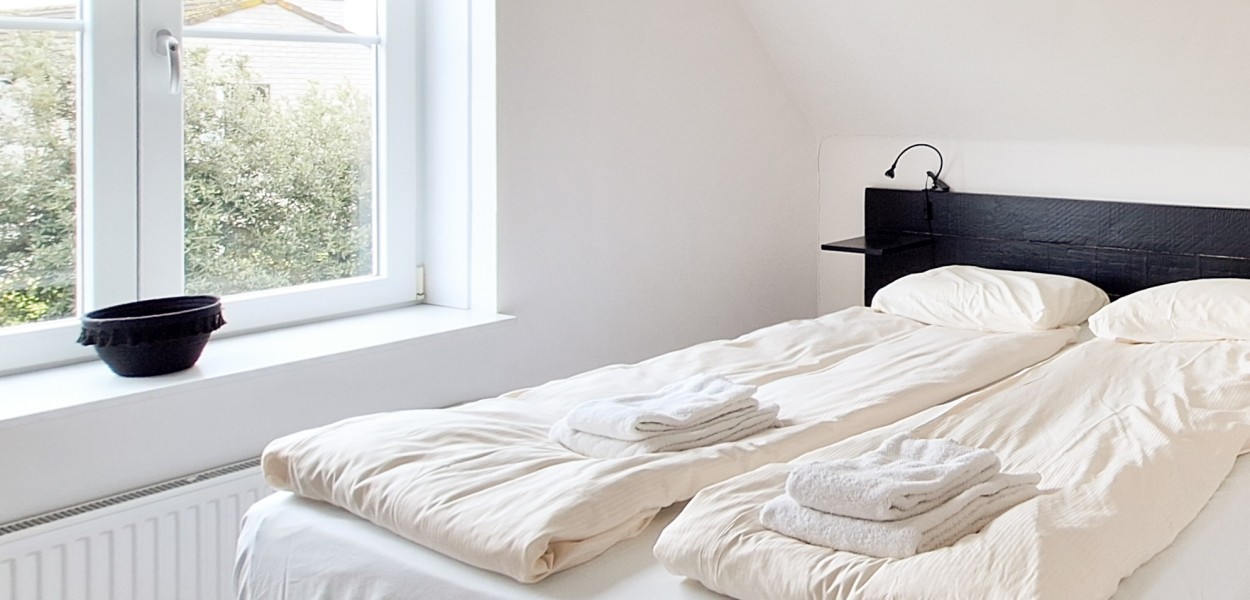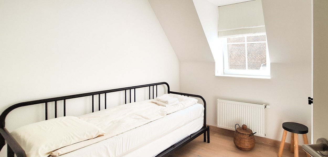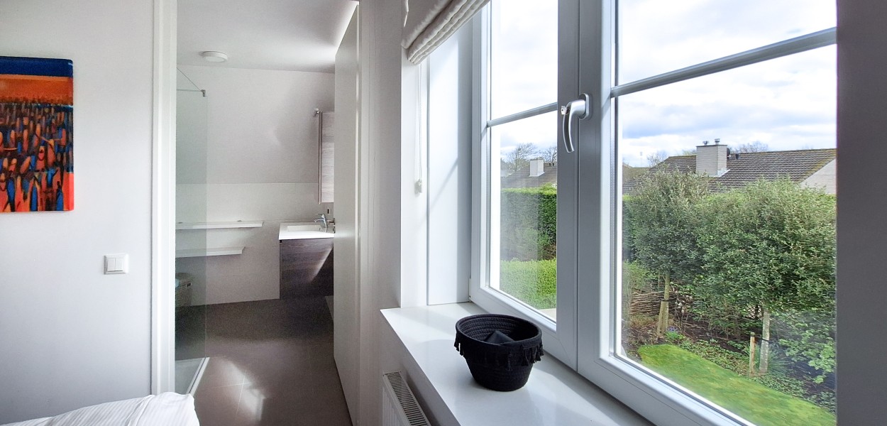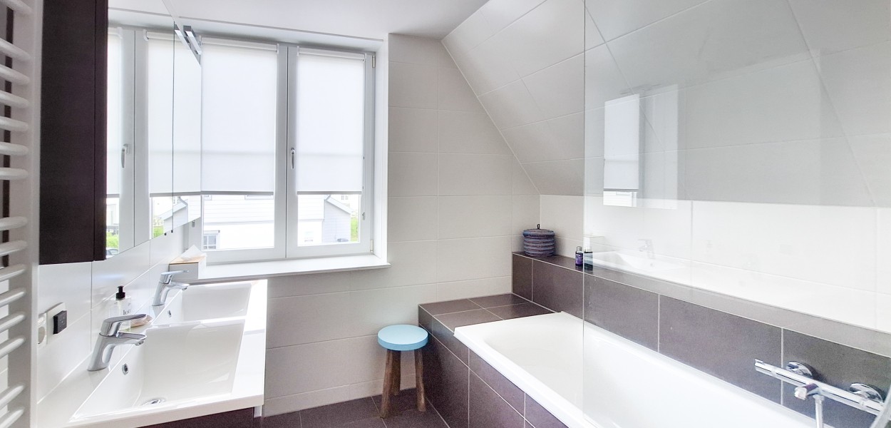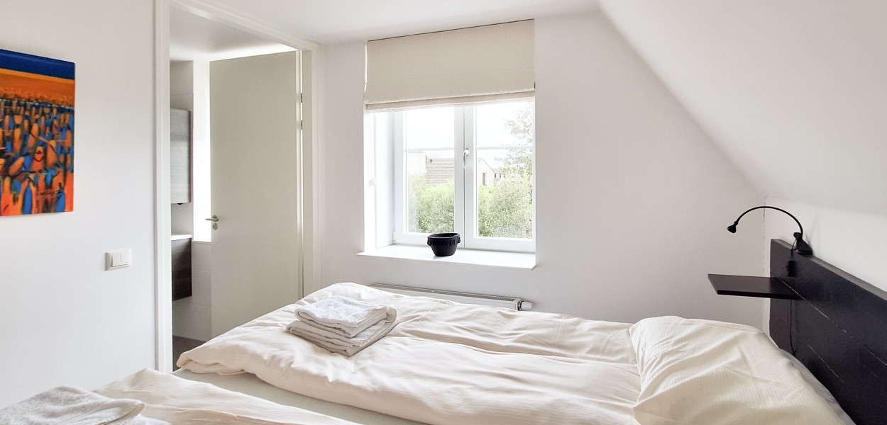Im ersten Stock befinden sich drei Schlafzimmer, von denen eines direkt mit einem Badezimmer mit begehbarer Dusche verbunden ist. In zwei der Schlafzimmer schlafen Sie auf luxuriösen Boxspring-Betten. Das dritte Schlafzimmer hat ein Einzelbett. Das zweite Badezimmer hat eine Badewanne mit Dusche und ein Doppelwaschbecken.