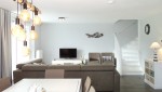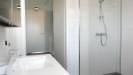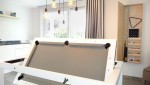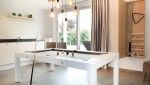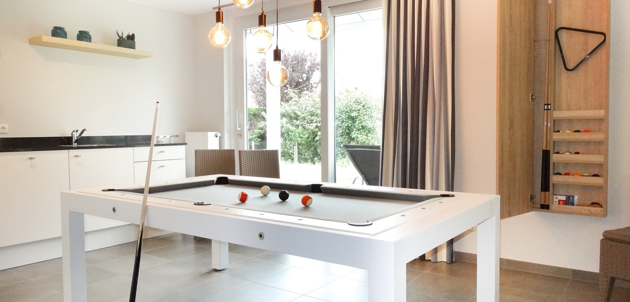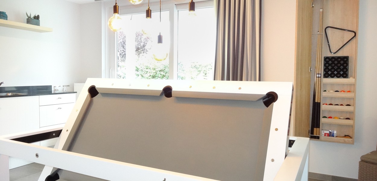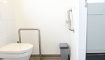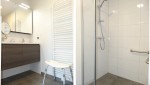 Im Erdgeschoss gibt es ein komfortables Wohnzimmer mit eine offene komplett ausgestattete Küche. So finden Sie beispielsweise einen Geschirrspüler, ein Induktionskochfeld, eine Kombi-Mikrowelle und einen Kühlschrank mit Gefrierfach. Der große Esstisch bietet genügend Platz für acht bis zehn Gäste und kann in einen Billardtisch verwandelt werden, wenn man die Tischplatte umdreht. Eine tolle Möglichkeit, sich zu unterhalten, auch wenn das Wetter mal nicht mitspielen will. Sowohl von der Küche als auch vom Wohnzimmer aus kommen Sie durch die Gartentüren direkt auf die Terrasse und in den 150 m² großen, sonnigen Garten. An der Vorderseite der Villa gibt es ein geräumiges Schlafzimmer mit komfortablen Boxspringbetten und ein behindertengerechtes Badezimmer mit einer großen Dusche und Doppelwaschbecken. Da auf die Barrierefreiheit viel Wert gelegt wurde, gibt es in der Dusche feste Bügel, einen Duschhocker sowie einen zusätzlichen Spiegel in passender Höhe für Rollstuhlfahrer.